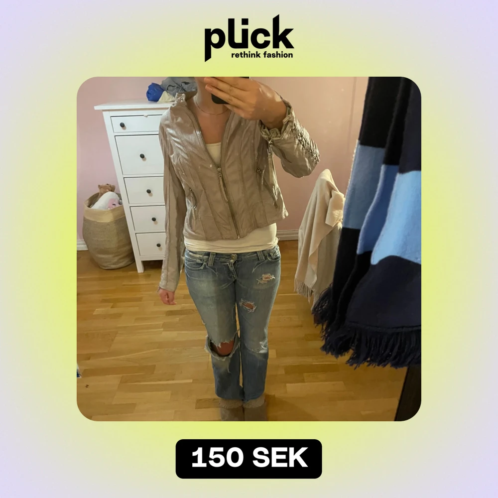Säljer en snygg beige skinnjacka i bra skick. Jackan har en cool dragkedja framtill och långa ärmar med snygga detaljer. Perfekt för höst och vår, och funkar både till vardags och fest. Jag är 168cm lång och skulle säga att den känns som en xs-s