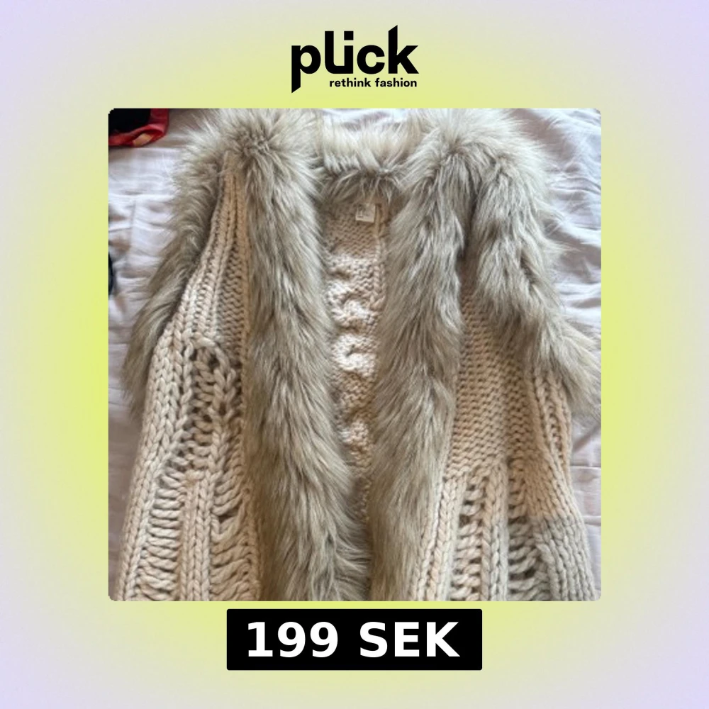 Säljer en beige stickad väst med grova flätstickade detaljer och en bred, superfluffig pälsimitation runt kragen och framstycket. Västen har en chunky look och är perfekt för dig som gillar att sticka ut med coola texturer och lager på lager.