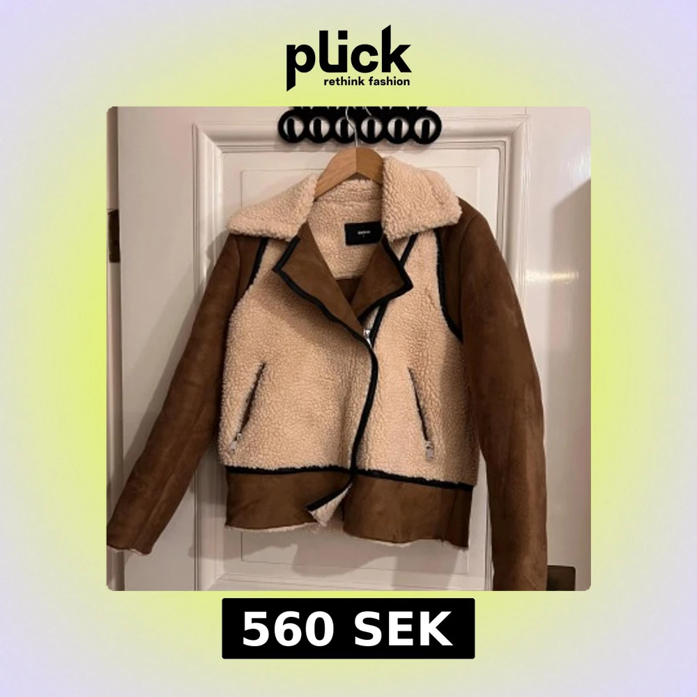 Säljer en beige teddyjacka från Bik Bok med bruna mockadetaljer och svarta kantband. Jackan har bred krage, varm och trendig look.