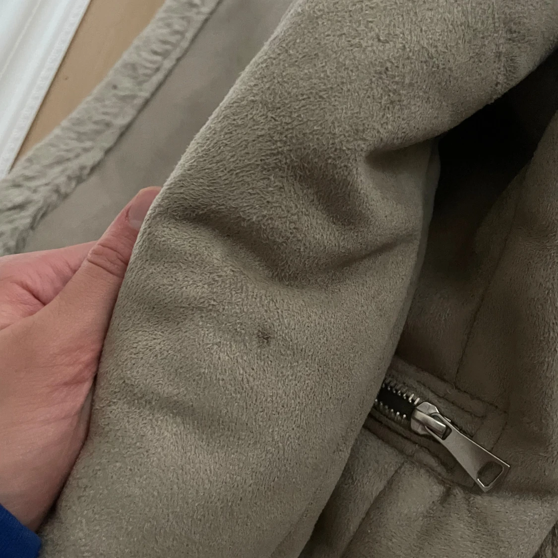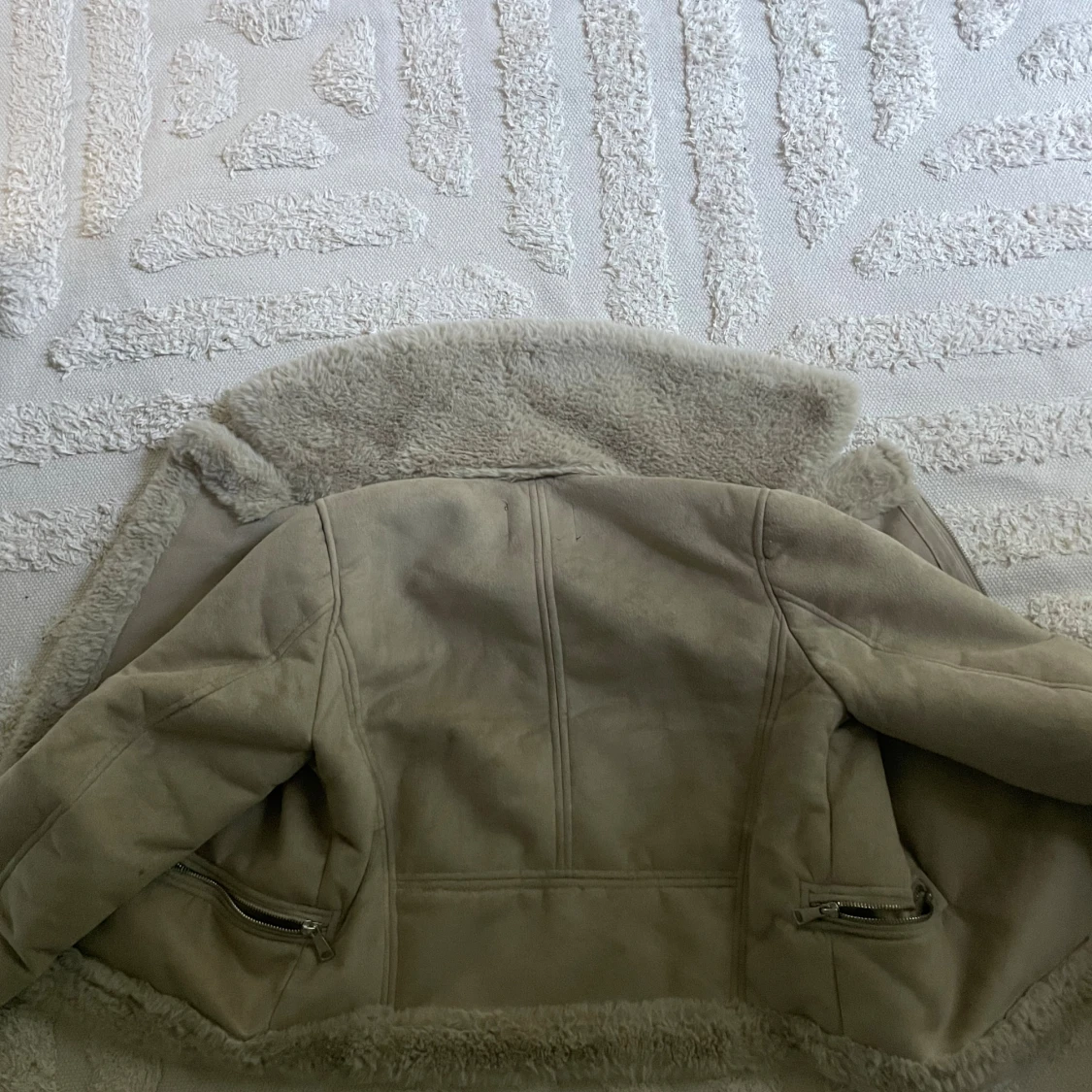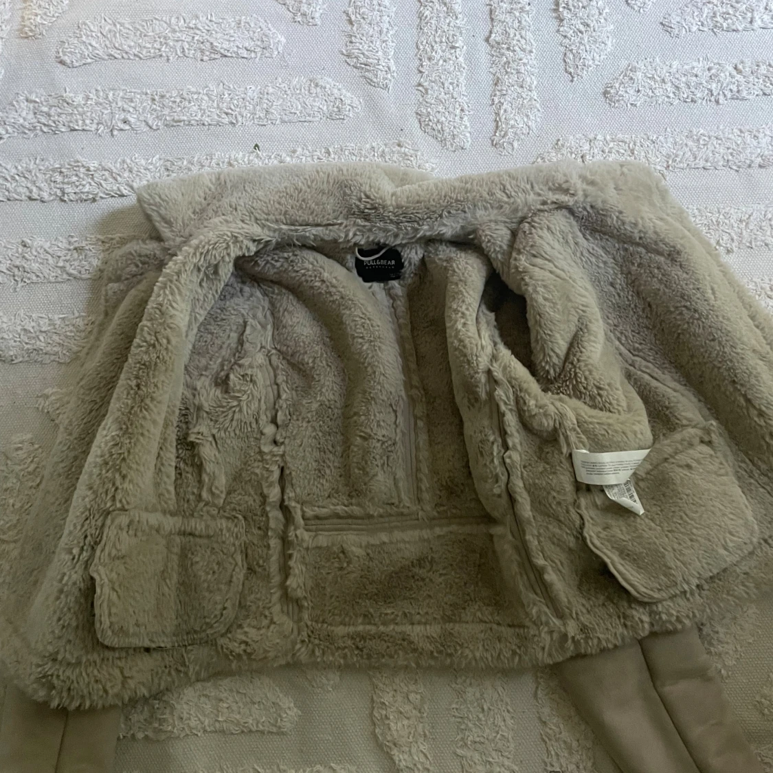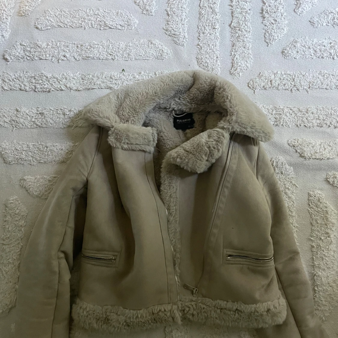 Säljer en beige teddyjacka från Pull&Bear med fluffigt foder och stora slag. Jackan har dragkedja framtill, två fickor med dragkedja och mjukt material både in- och utvändigt. Perfekt för kalla dagar och ger en chill vibe till din outfit.