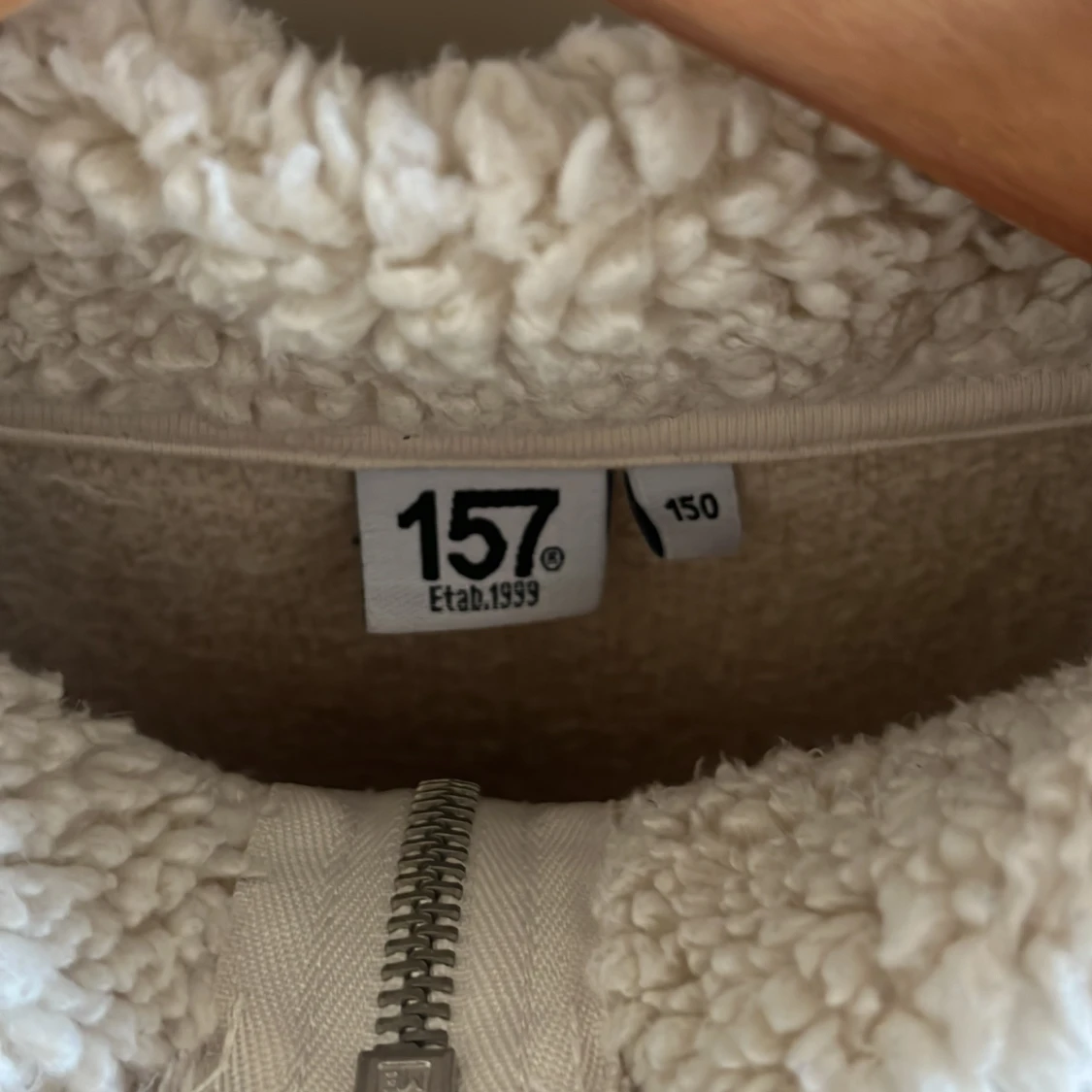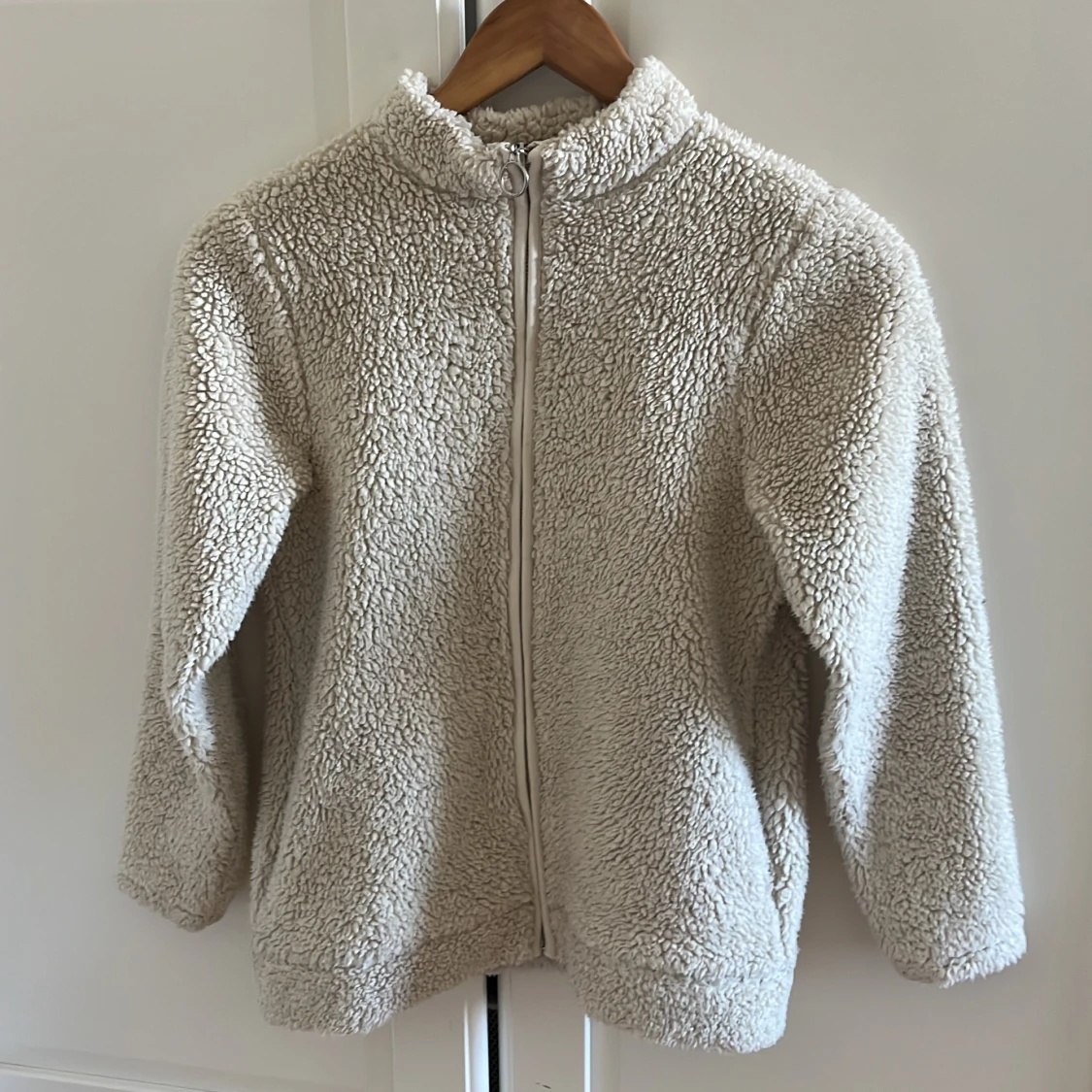 Mysig beige teddyjacka från lager 157 med dragkedja framtill. Perfekt för kyliga dagar med sin fluffiga och varma design. Jackan har långa ärmar och en hög krage för extra värme.