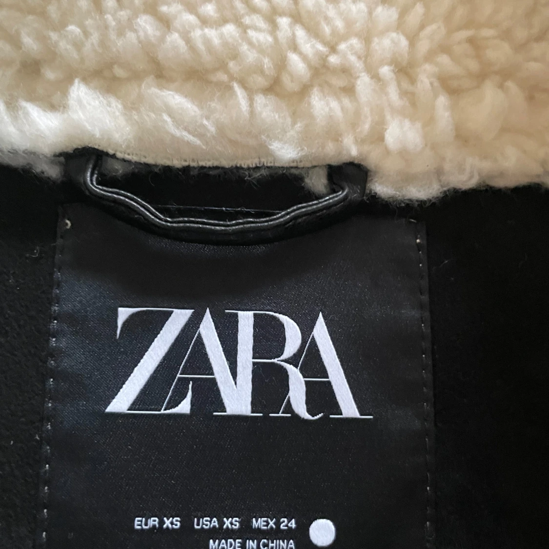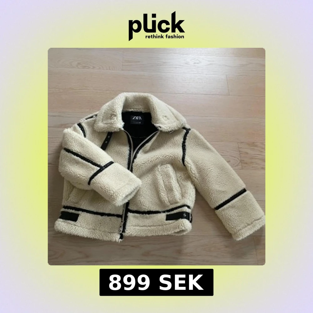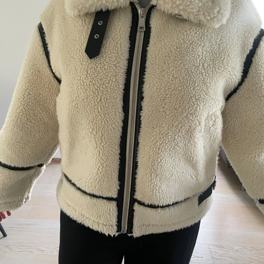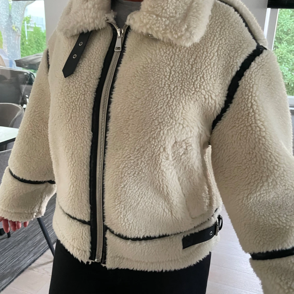 Säljer en beige teddyjacka från Zara i storlek XS. Jackan har svarta detaljer, dragkedja framtill, stor krage och två fickor. Den är fluffig och har en oversized passform, perfekt för kalla dagar. Snygg kontrast mellan det ljusa materialet och de svarta linjerna. Aldrig använd