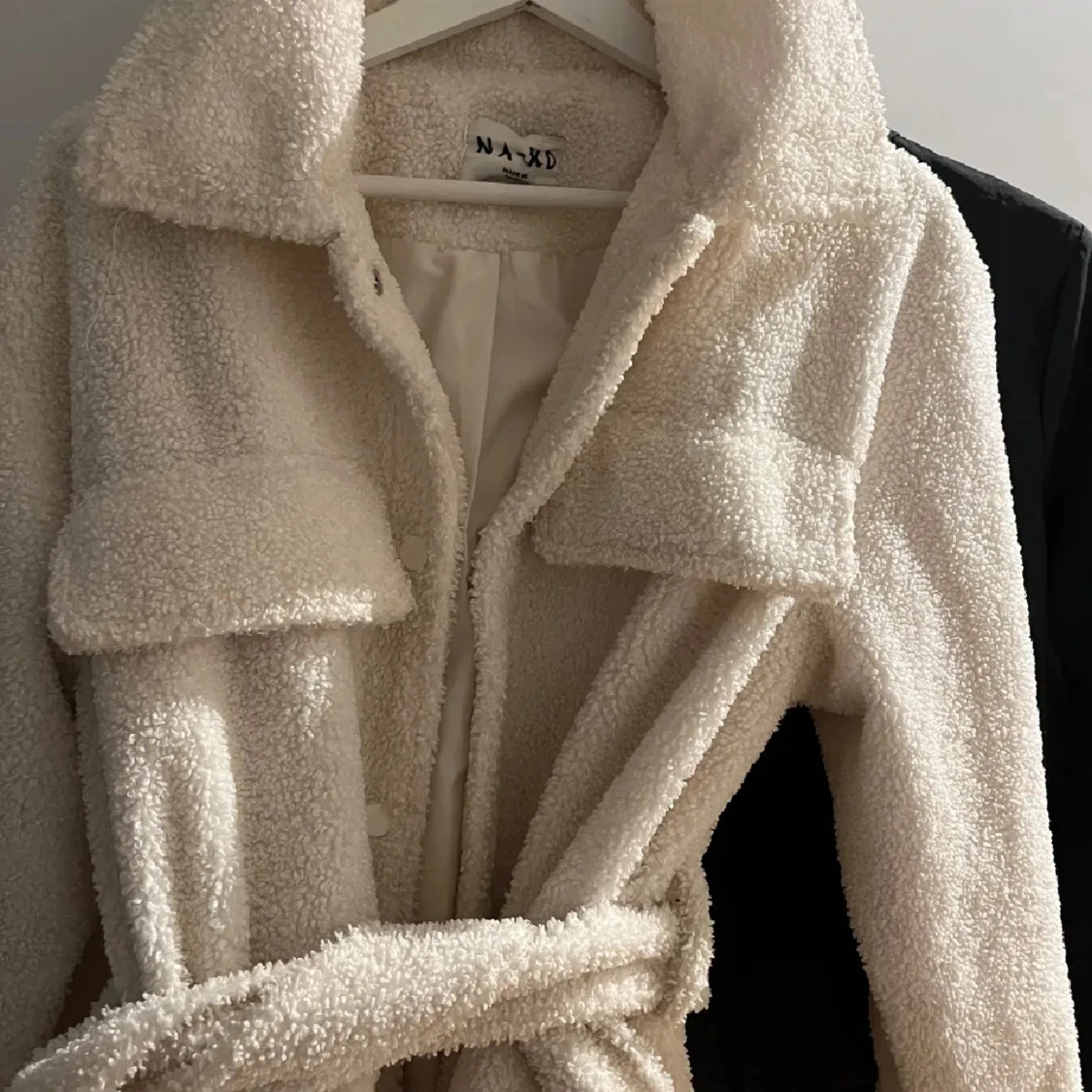 Mysig beige teddyjacka från NA-KD med krage, stora bröstfickor och knytskärp i midjan. Jackan har lång ärm och är perfekt för kyligare dagar. Stängs med bälte för en avslappnad look.