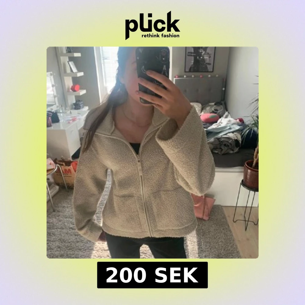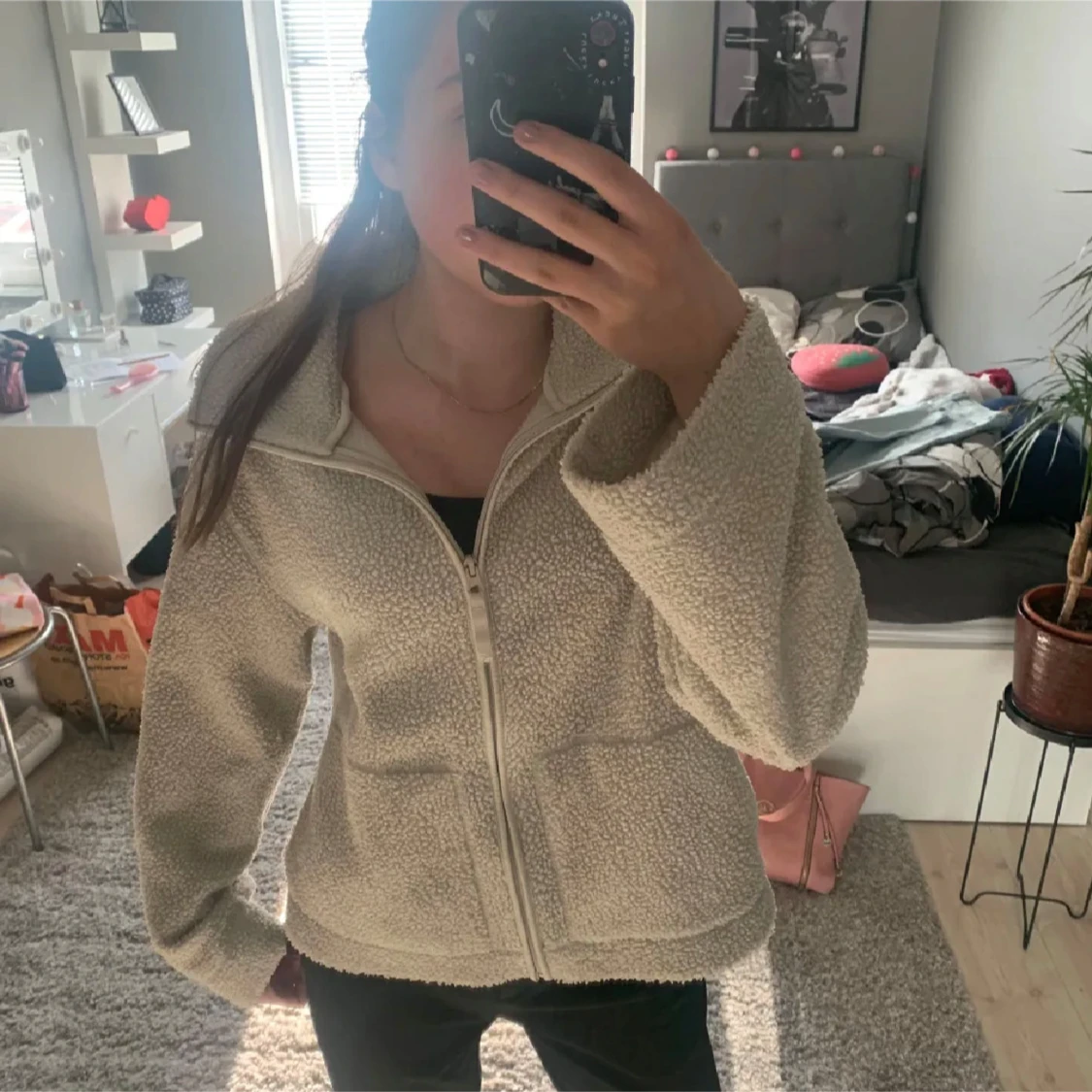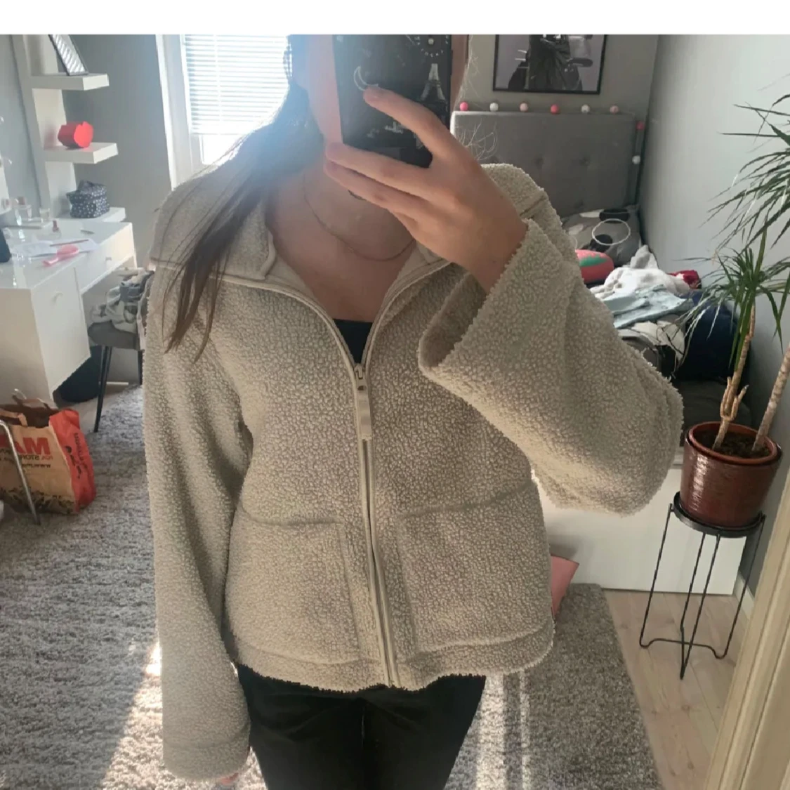 Mysig beige teddyjacka med hel dragkedja framtill och två stora fickor. Jackan har en avslappnad passform och hög krage, perfekt för kyliga dagar. Materialet är fluffigt och ger en riktigt skön vibe. Enkel att matcha med både jeans och leggings.