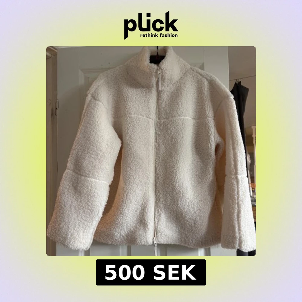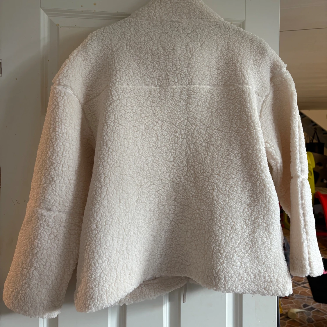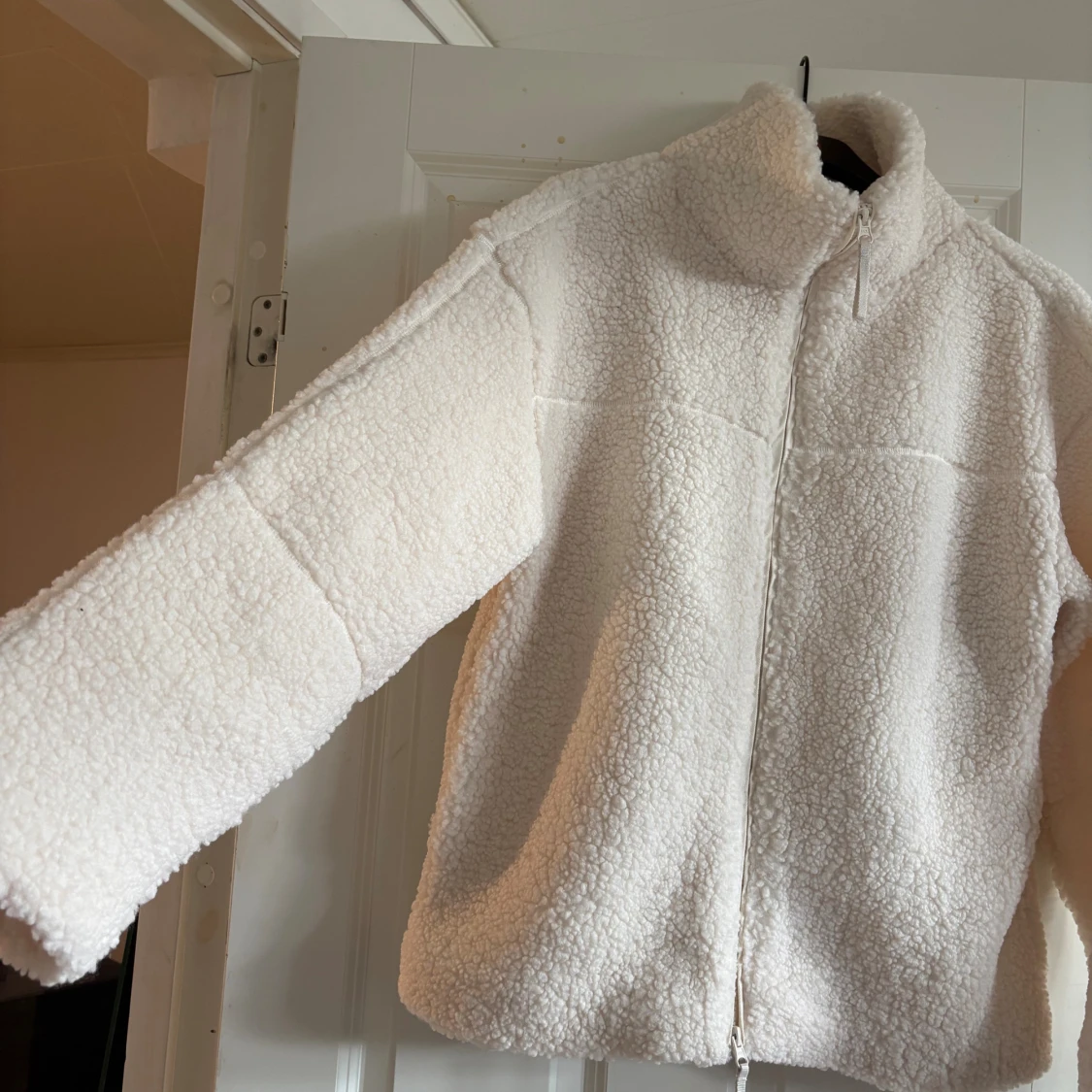 Mysig och oversized teddyjacka i beige med hög krage och hel dragkedja framtill. Jackan har lång ärm och är tillverkad i fluffigt teddy-material som ger en cool och avslappnad vibe. Helt ny, säljer då jag vill köpa en mindre storlek!