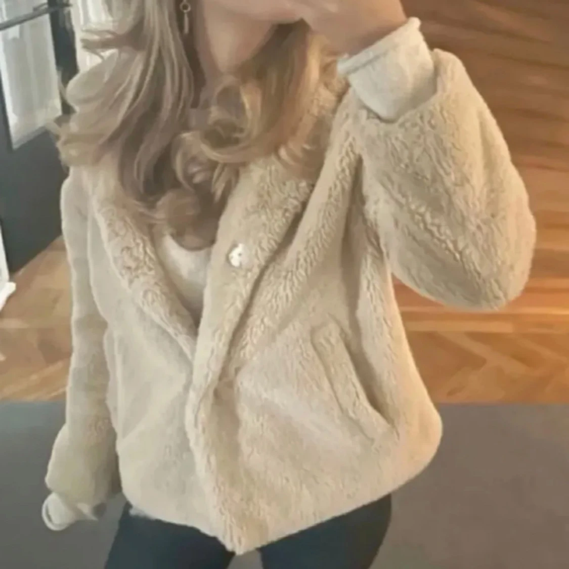 Mysig beige teddyjacka med huva, perfekt för kyliga dagar. Jackan har en avslappnad passform och stängs med knappar framtill. Den är både stilren och bekväm, vilket gör den till ett mångsidigt plagg i garderoben.