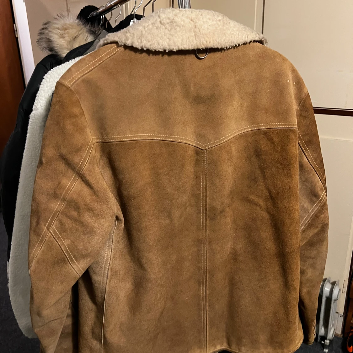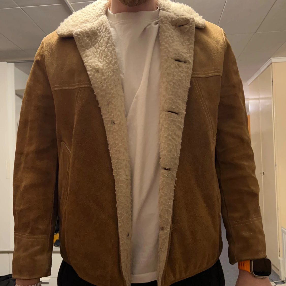 Säljer en beige teddyjacka med mjukt, fluffigt foder och bred krage. Äkta fin jacka från 70/80-talet. Utsidan är i mocka och insidan har ett krämvitt teddyfoder som syns vid öppningen och kragen. Jackan har två snedställda fickor och stilrena sömmar. Perfekt för kalla dagar. Jag är 183cm. STORLEK: liten L eller Stor M