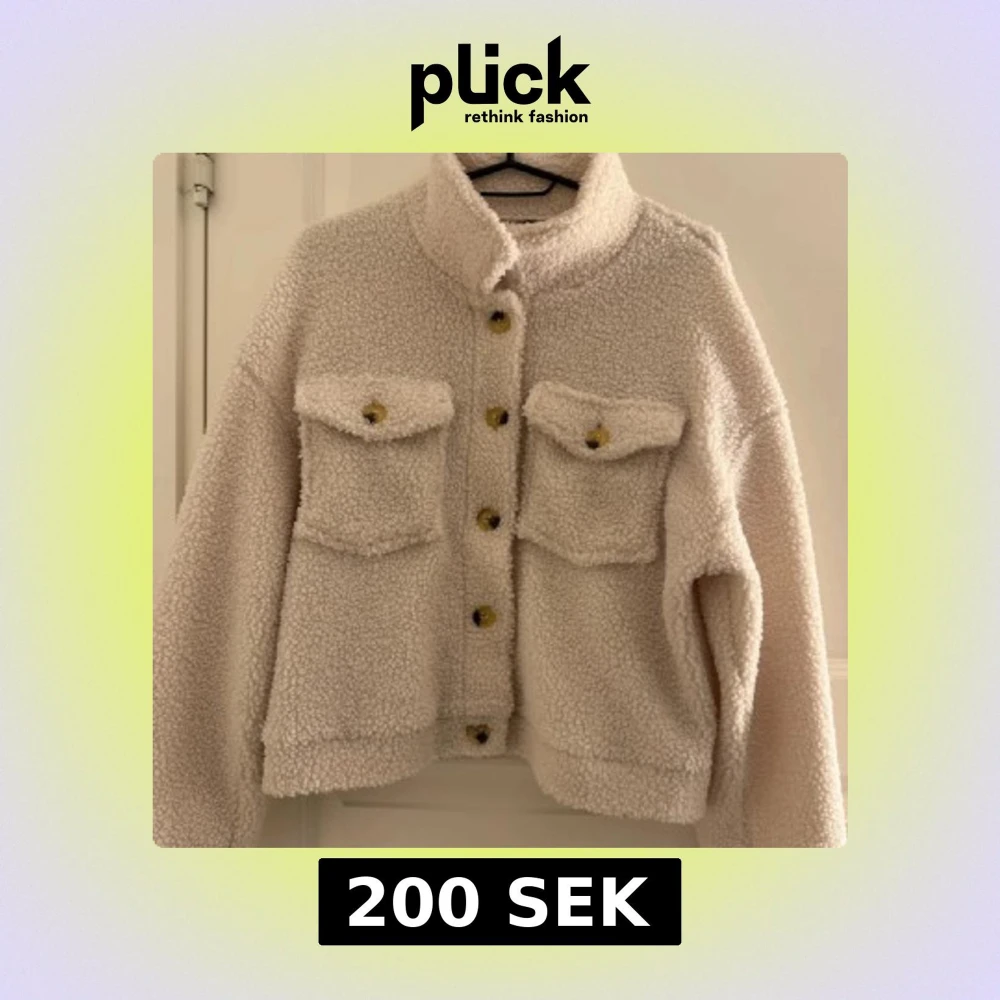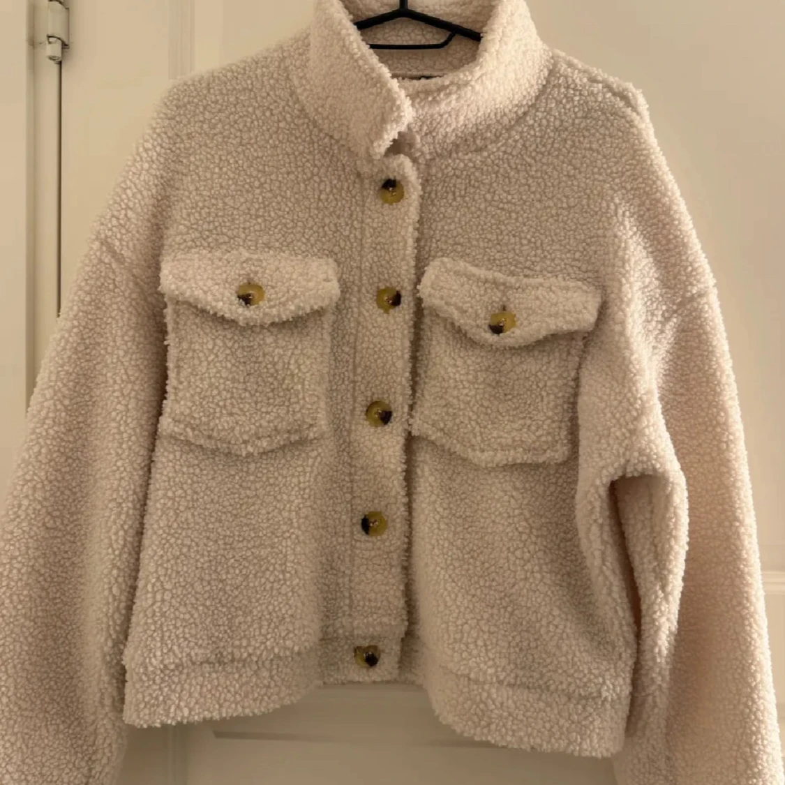 Supermjuk och fluffig beige teddyjacka med stora bröstfickor och knappar framtill. Jackan har en boxig passform och hög krage, perfekt för lager-på-lager. Snygg att styla till både jeans och kjol för en chill look.