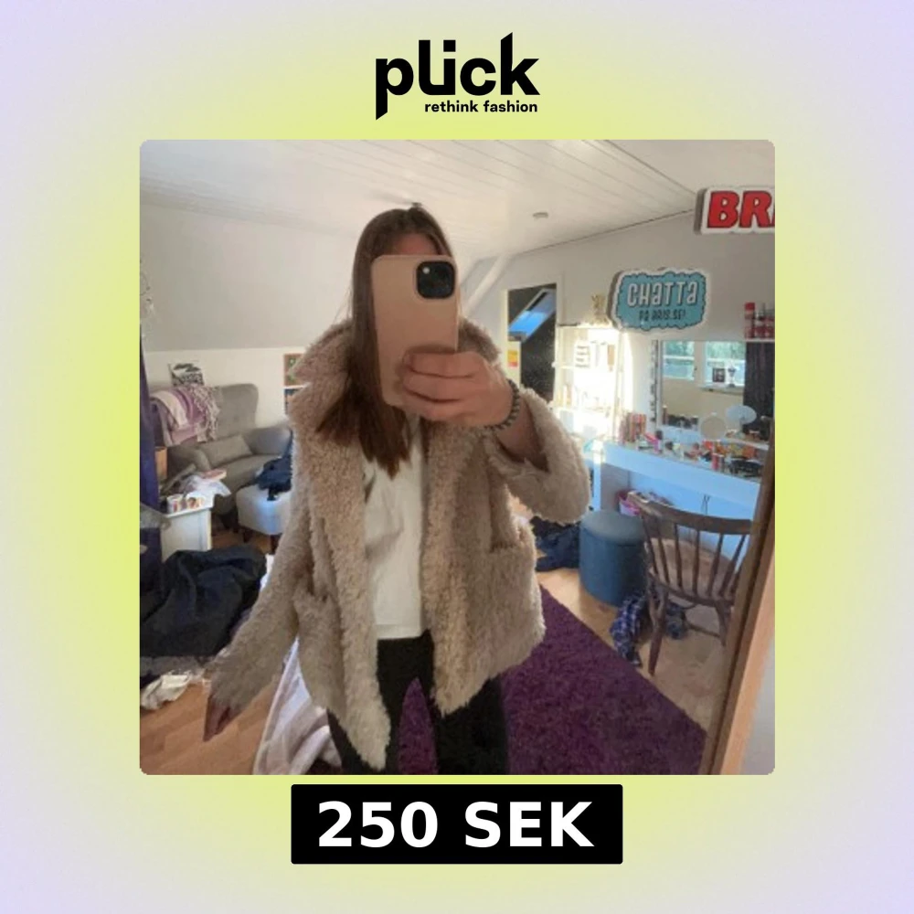 Supermysig beige teddyjacka med fluffigt material och stora fickor framtill. Jackan har en bred krage och är långärmad, perfekt för kyliga dagar. Passformen är lite loose och den är enkel att slänga på sig över vilken outfit som helst.