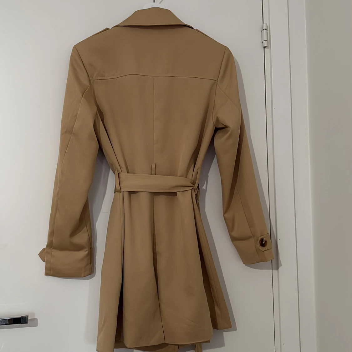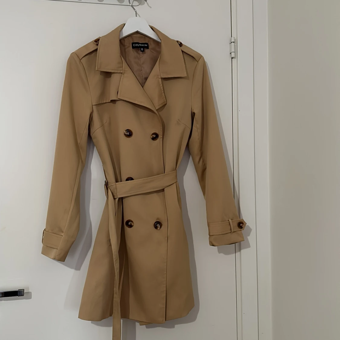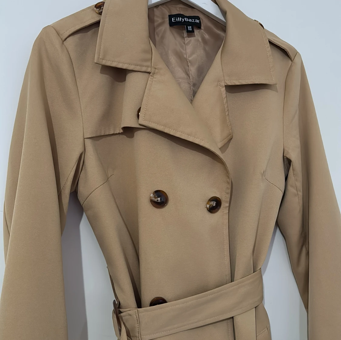 Stilren beige trenchcoat från EllyBazar i storlek XS. Jackan har dubbelknäppning, klassisk krage, bälte i midjan och snygga knappar på ärmsluten. Perfekt för dig som vill ha en tidlös look med lite edge.