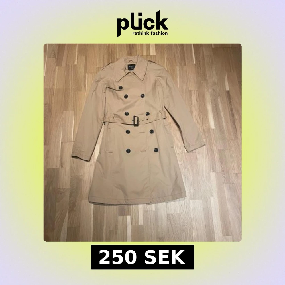 Snygg beige trenchcoat från Lindex i klassisk modell med dubbelknäppning, bälte i midjan och stora kragar. Jackan har långa ärmar och svarta knappar framtill. Perfekt för dig som gillar stilrena och tidlösa plagg.