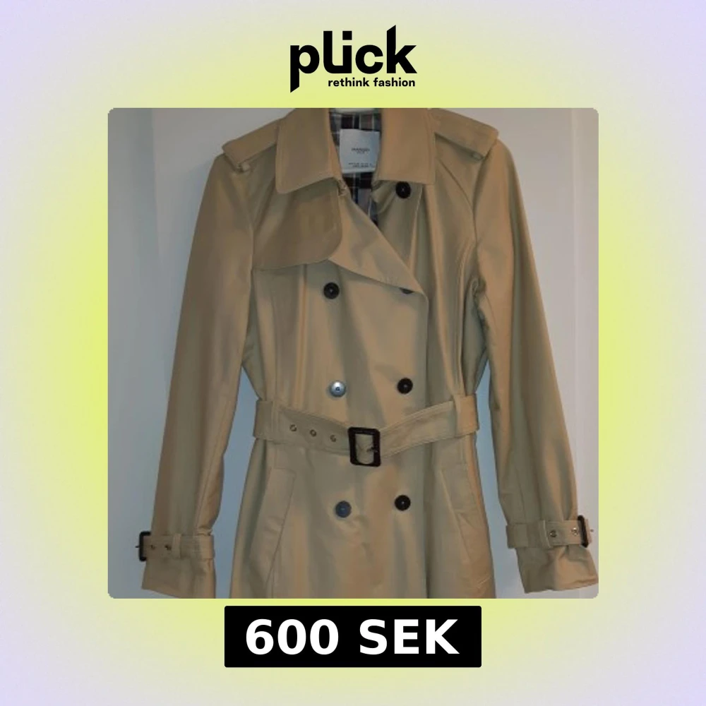 Snygg beige trenchcoat från Mango aldrig använt, med klassisk dubbelknäppning och bälte i midjan. Jackan har långa ärmar och ett stilrent rutigt foder. Perfekt för höst och vår!