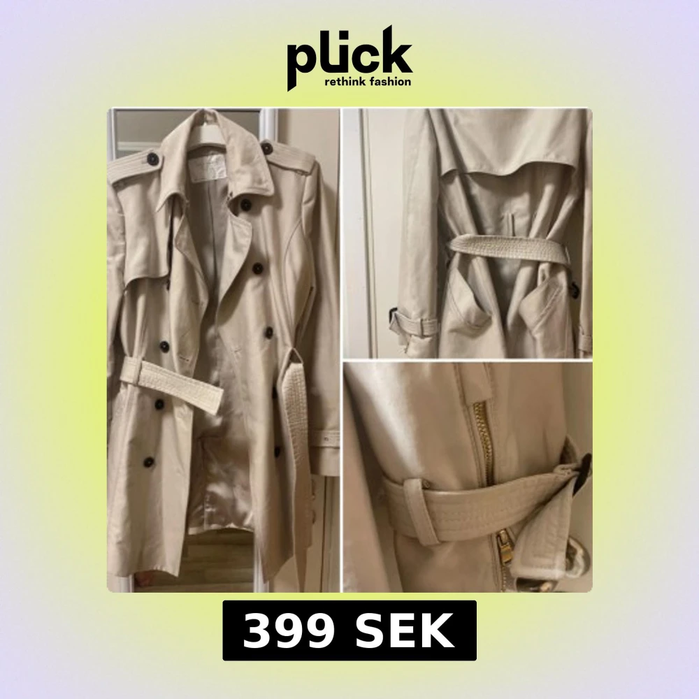 Snygg beige trenchcoat med klassisk dubbelknäppning, axelklaffar och bälte i midjan. Jackan har långa ärmar, svarta knappar och detaljer som dragkedja och fickor. Perfekt för dig som gillar stilrena och tidlösa plagg.