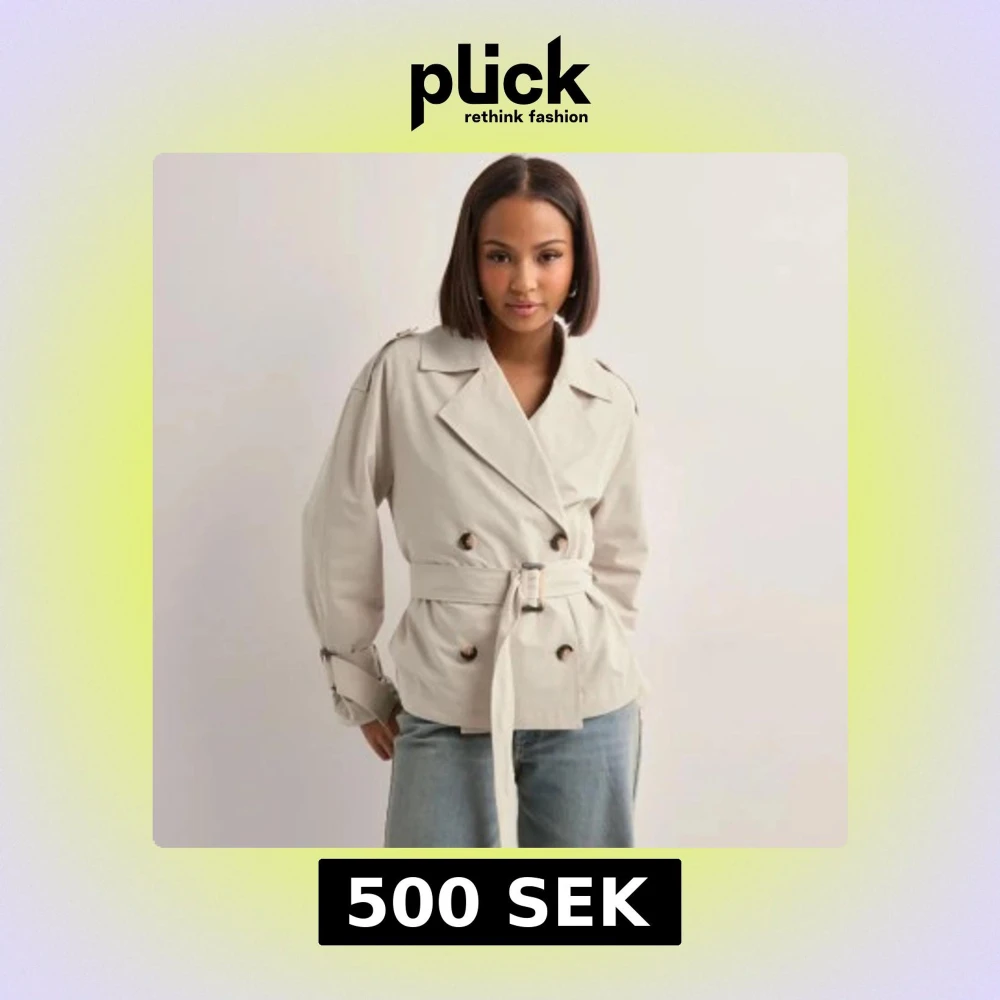 Oanvänd beige trenchcoat med dubbelknäppning och bälte i midjan från Nelly.com. Slutsåld på hemsidan. Nypris: 699kr.