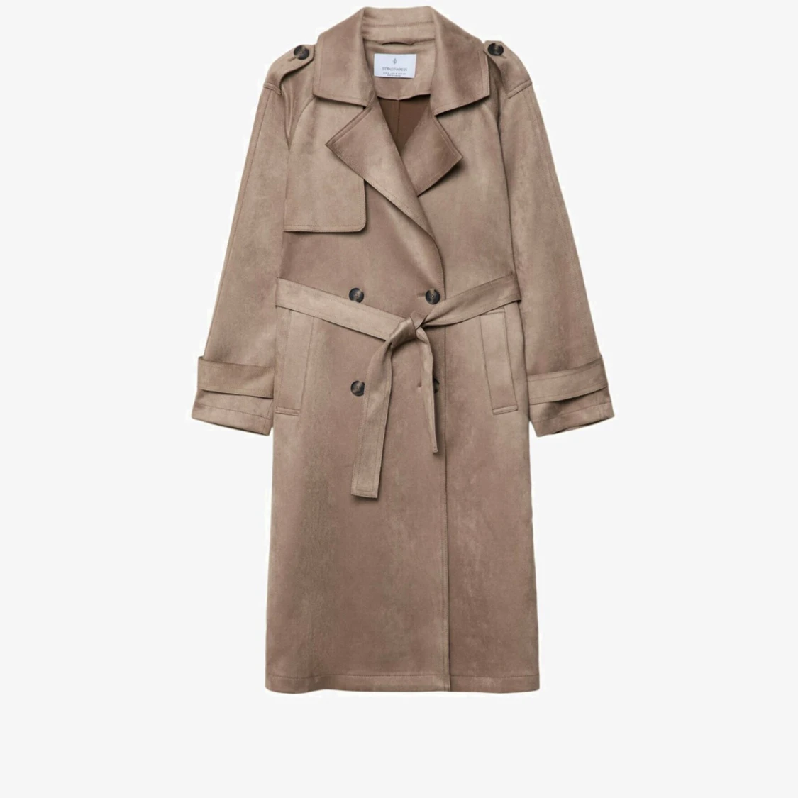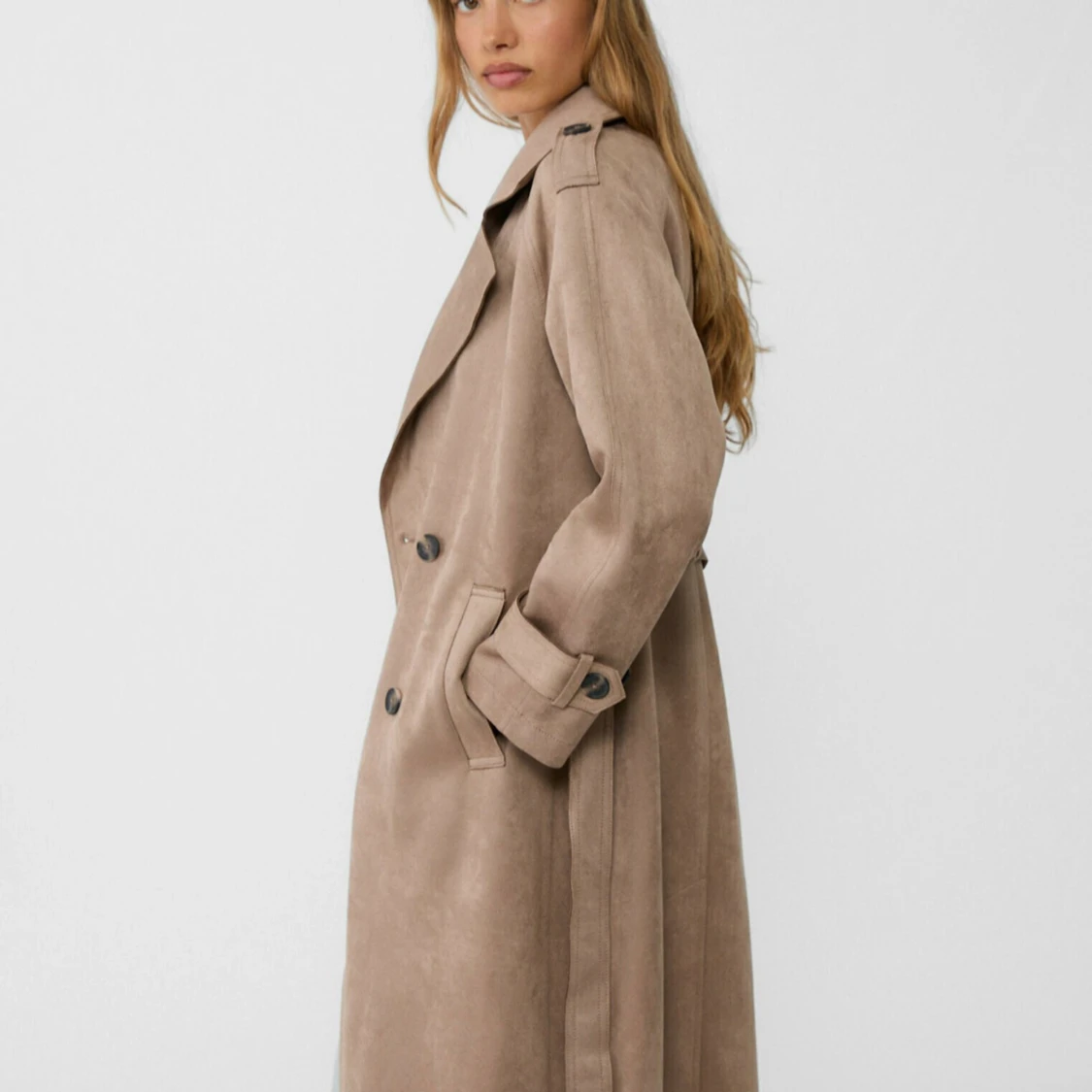 Snygg beige trenchcoat från Stradivarius i mjukt material. Jackan har klassisk krage, knappar framtill, bälte i midjan och långa ärmar med spänndetaljer. Perfekt för lager-på-lager och en chill look.
