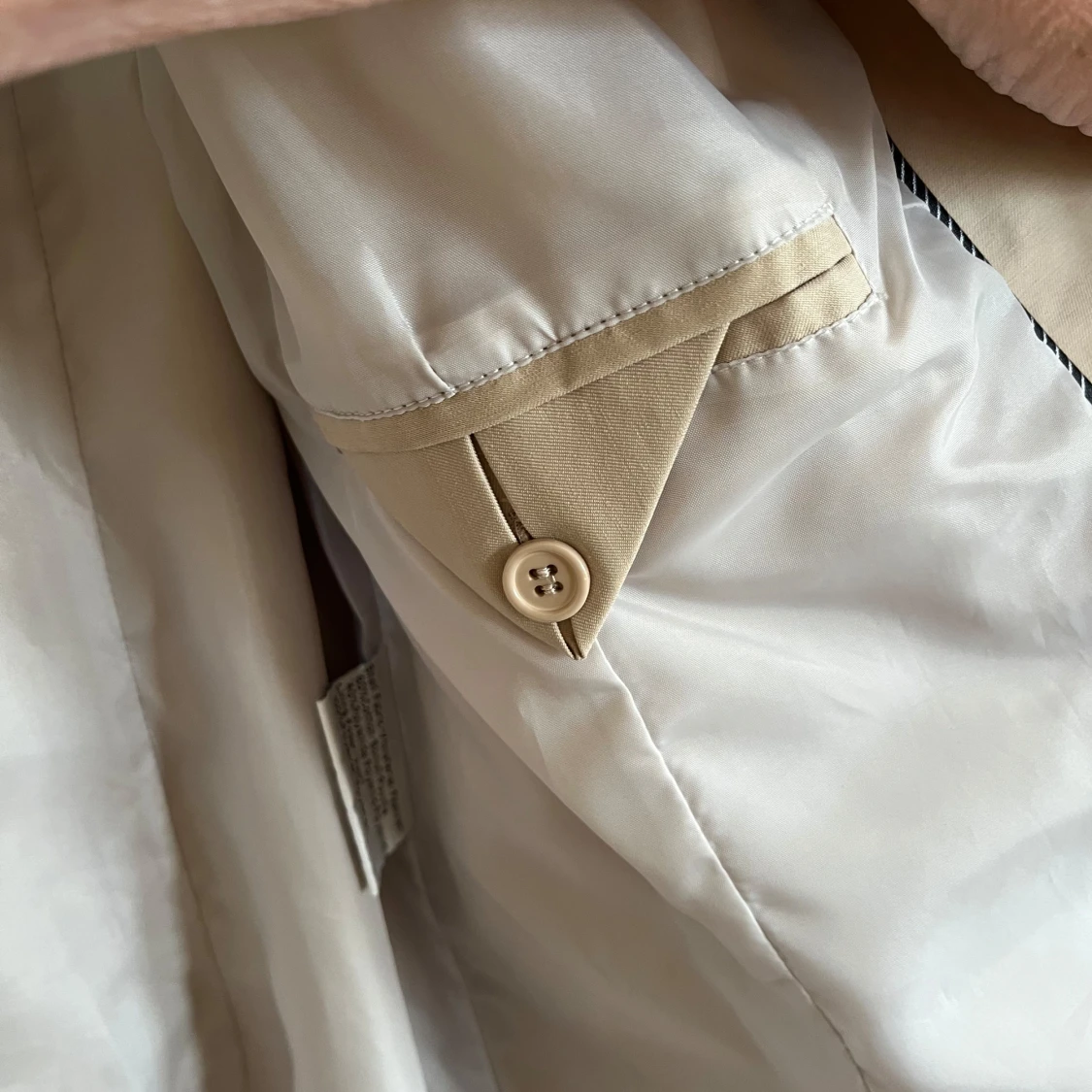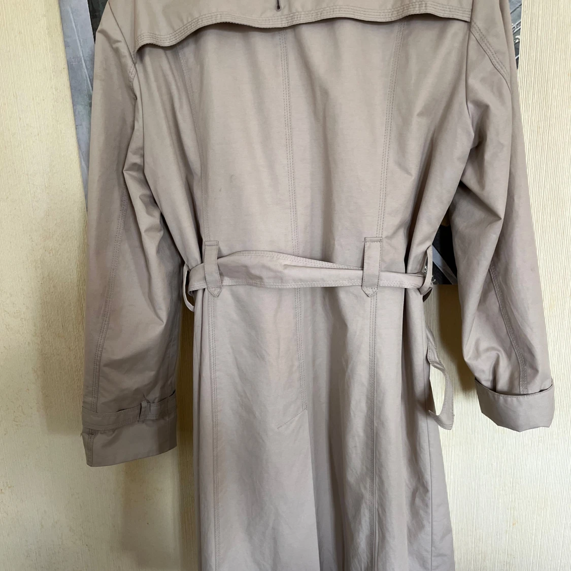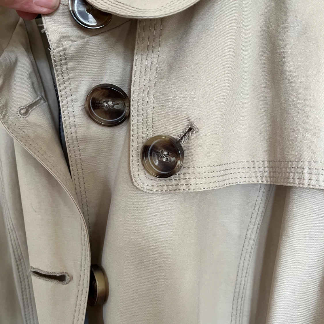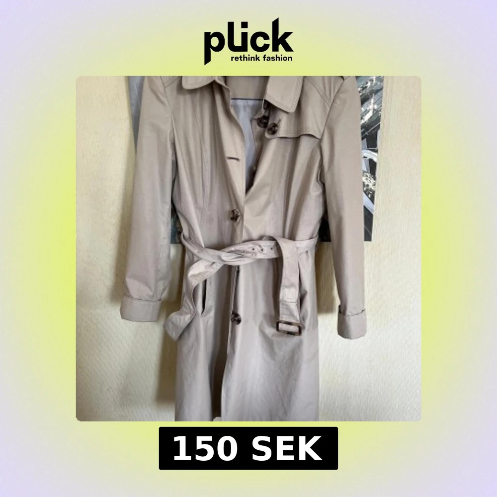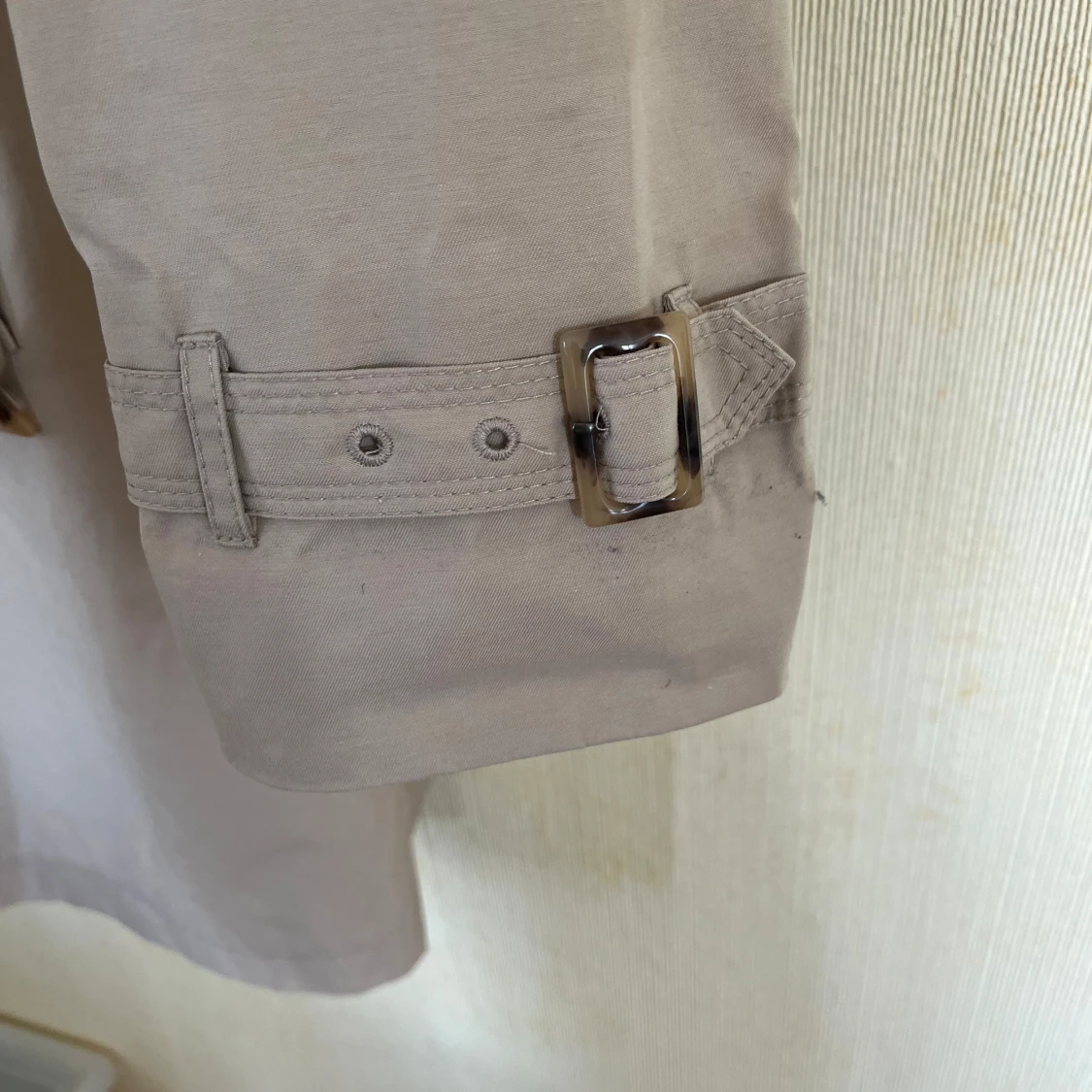 Stilren beige trenchcoat med klassisk krage, knappar framtill och tillhörande bälte i midjan. Jackan har långa ärmar med spänne vid ärmslut och är tillverkad i ett bomullsliknande material. Perfekt för övergångssäsonger.