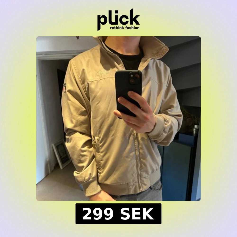 Säljer en stilren beige jacka. Jackan har en broderad logga på bröstet och en patch på ärmen. Perfekt för vår och höst!