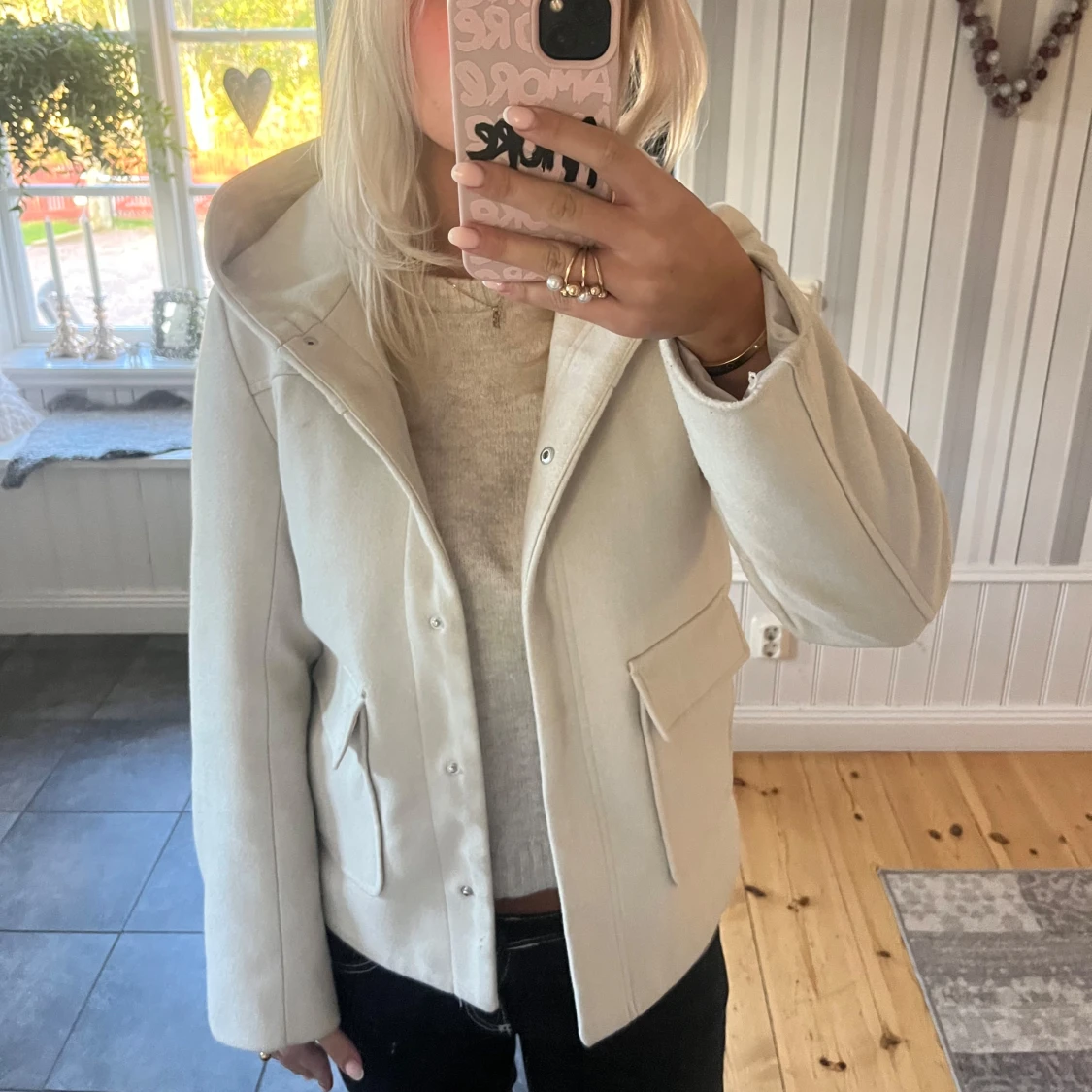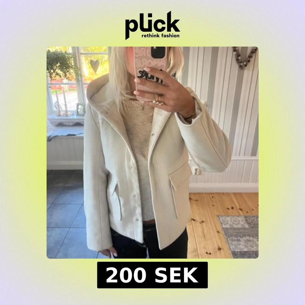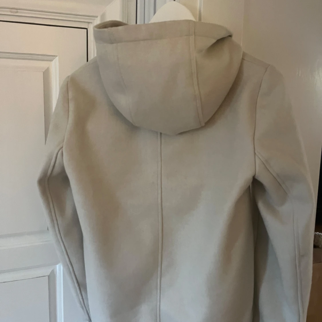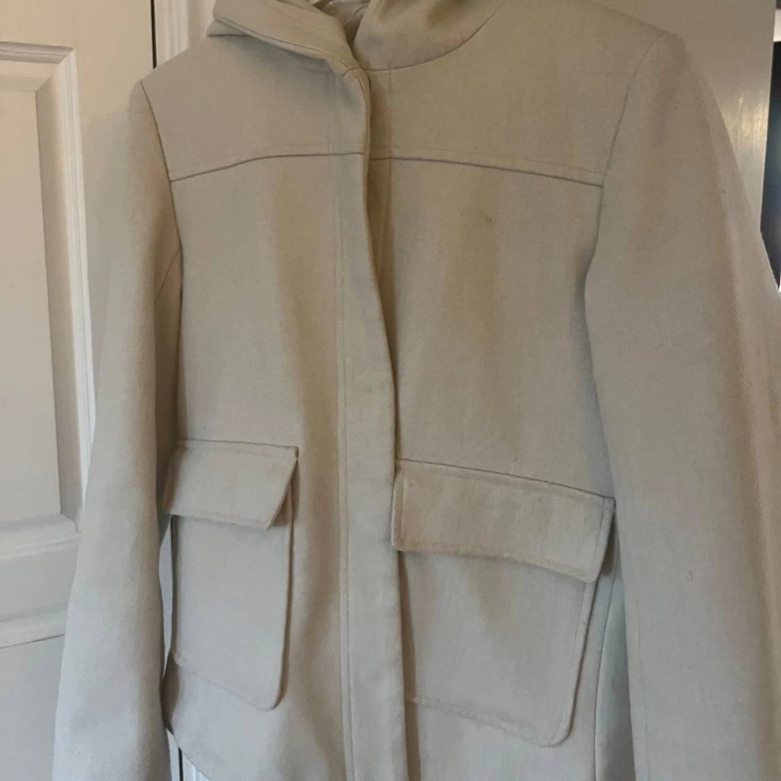 Stilren beige jacka i ullblandning med huva och stora fickor framtill. Jackan har rak passform, dold knäppning och långa ärmar. Perfekt för dig som gillar en clean och enkel look.