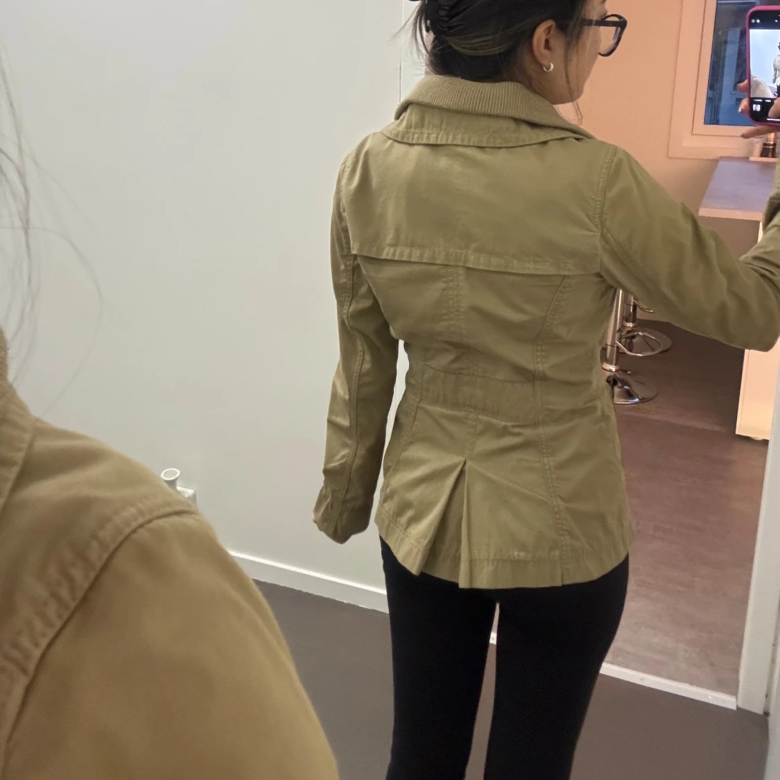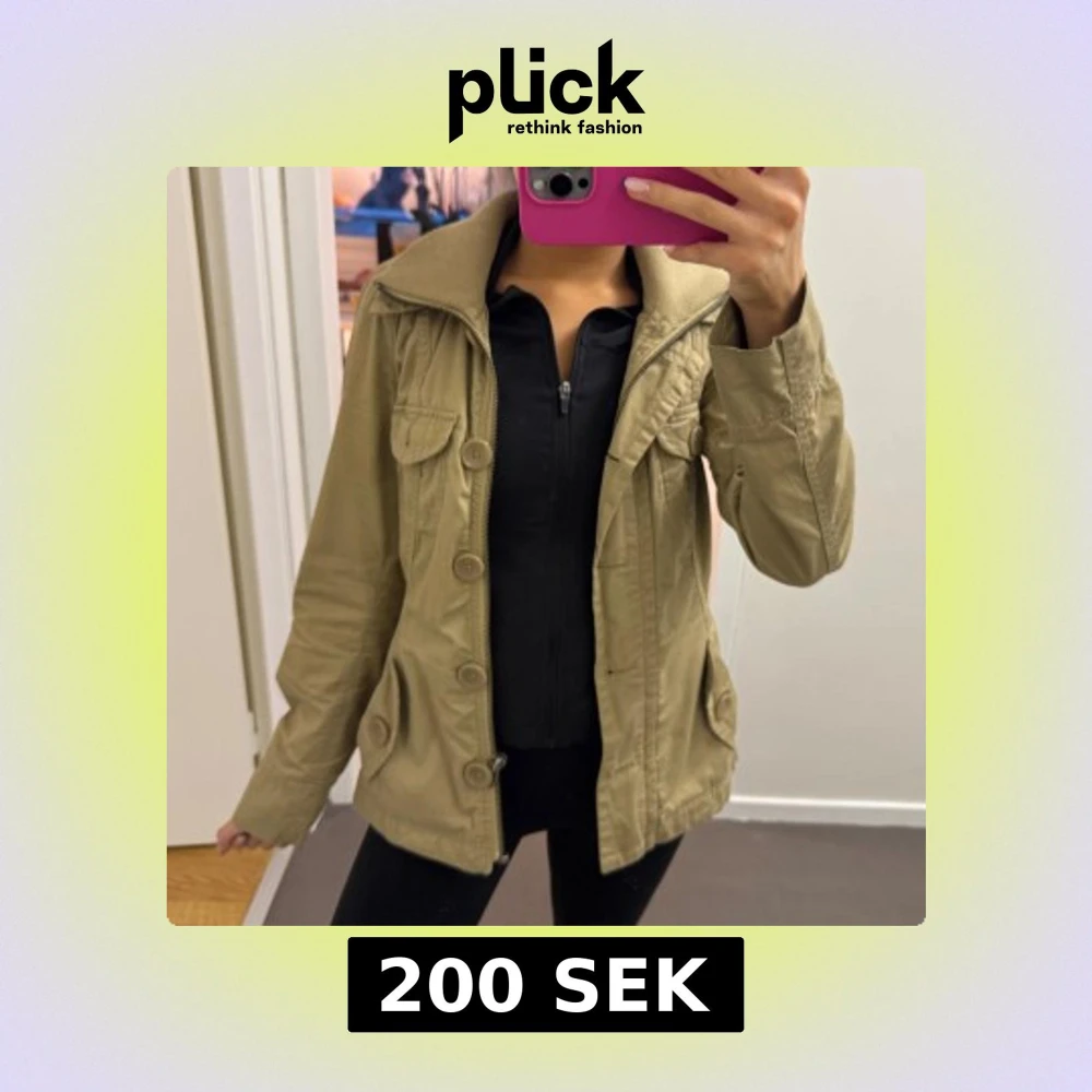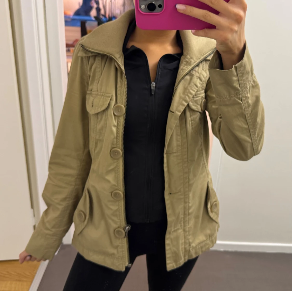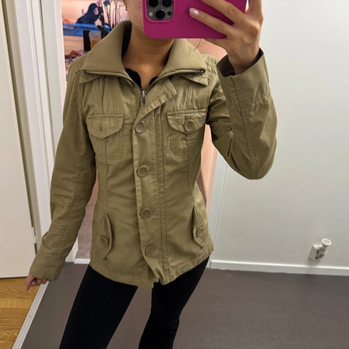 Säljer en beige utilityjacka med stora knappar framtill, dragkedja och flera fickor. Jackan har en klassisk krage och markerad midja för snygg passform. Perfekt för dig som gillar stilren och enkel design.
