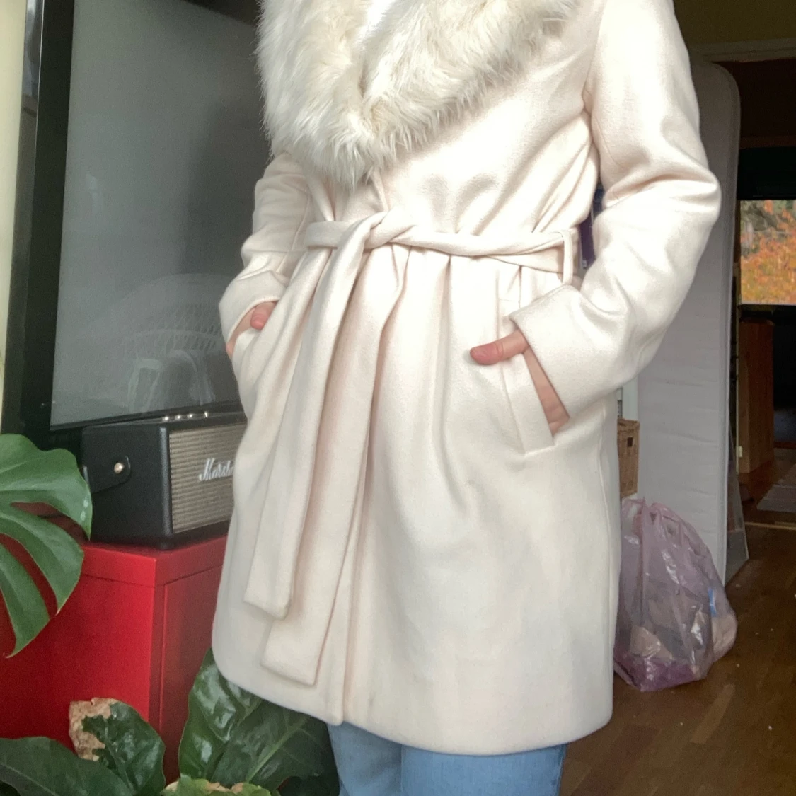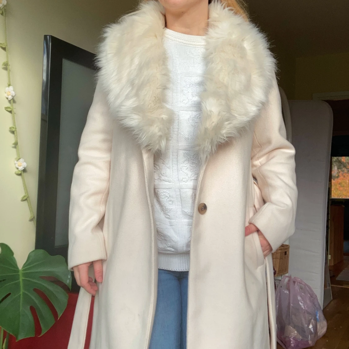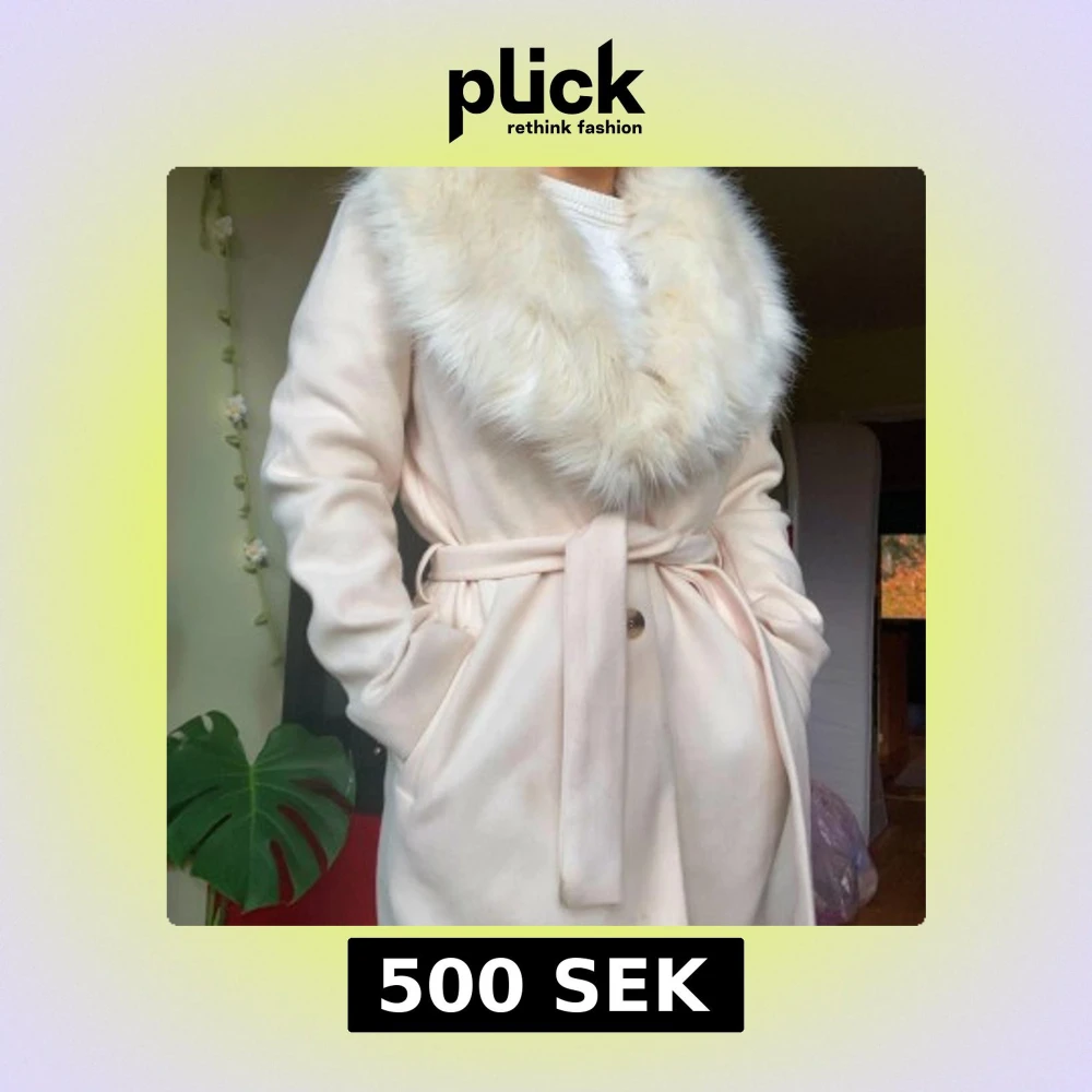 Snygg beige/off-white kappa från VILA med stor fluffig fuskpäls-krage och knytskärp i midjan i storlek 40. Passar mig som är 36/38 & S/M med en tjockare tröja under, så perfekt för lager på lager 🍁❄️ Originalpris 1045kr på Zalando. Så fin och perfekt för höst och vinter! Endast använd 1-2 gånger 🫶