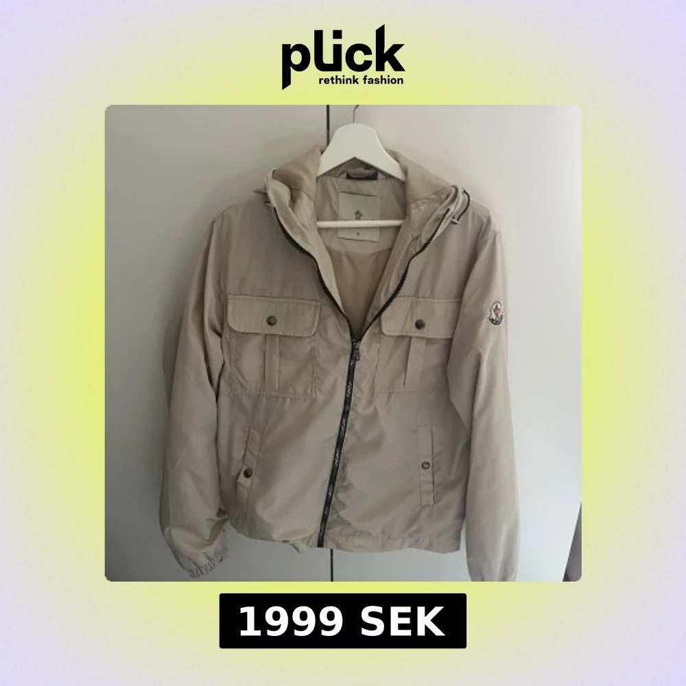 Snygg beige vindjacka från Moncler med huva och dragkedja. Jackan har två stora bröstfickor med knappar och Moncler-logga på ärmen. Tillverkad i polyester och fodrad med dun för extra värme. Perfekt för dig som vill ha en clean och stilren look. Size M