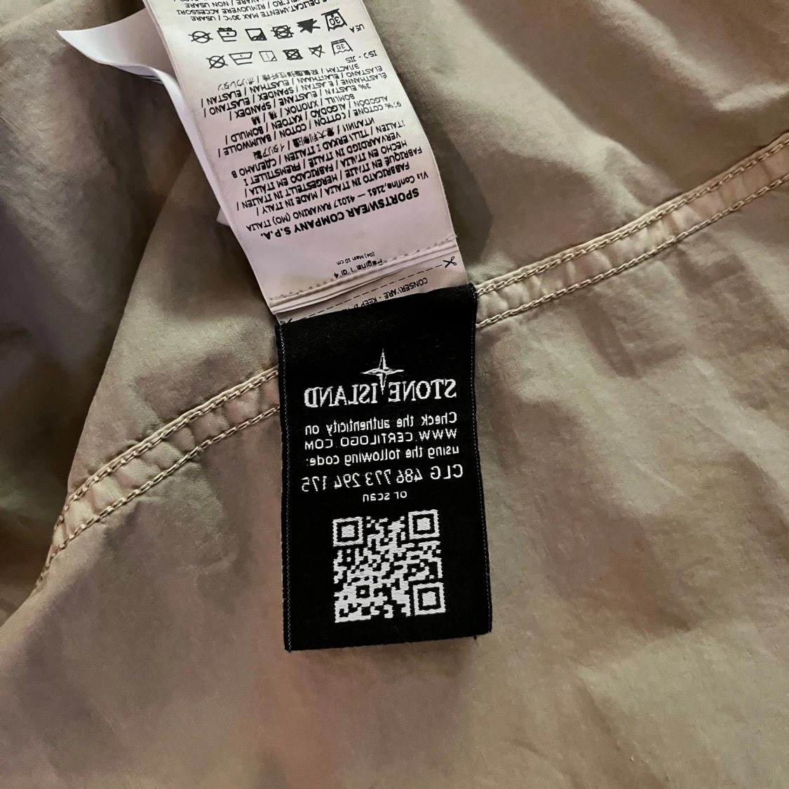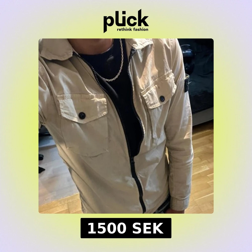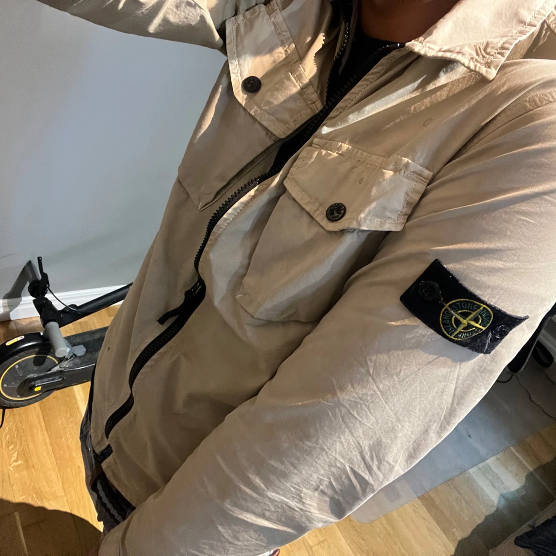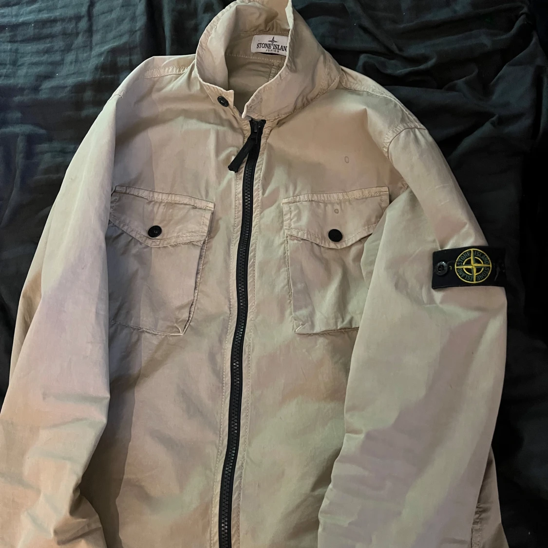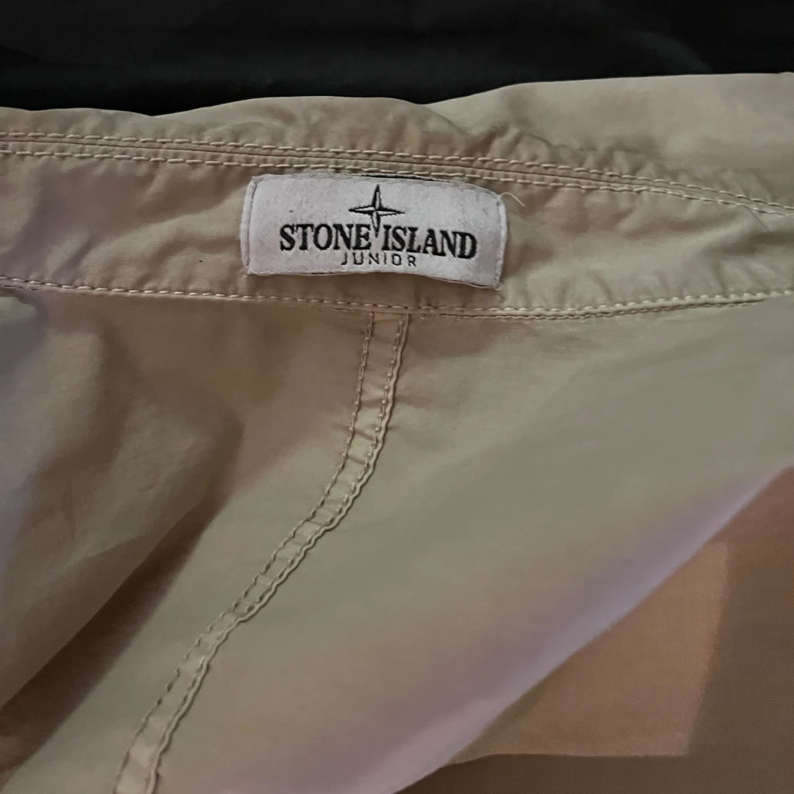 Säljer en beige vindjacka från Stone Island med klassisk patch på ärmen. Jackan har två stora bröstfickor med knappar, hög krage och dragkedja framtill. Materialet är lätt och polyester, perfekt för vår och höst. Passformen är normal och jackan är långärmad. Passar S men är storlek junior