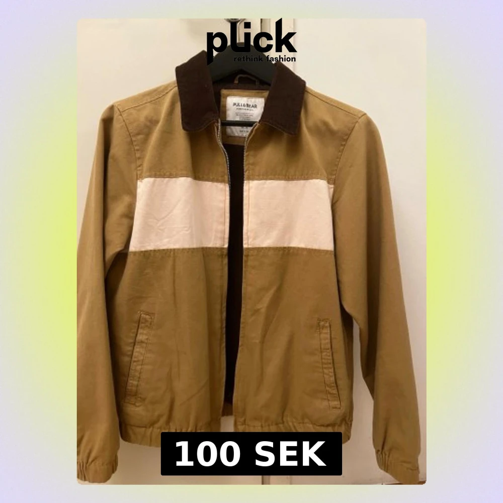 Snygg beige vindjacka från Pull&Bear i storlek S. Jackan har en vit horisontell panel över bröstet, bruna detaljer på kragen och dragkedja framtill. två fickor och elastisk nederkant. Perfekt för dig som gillar clean och retro stil