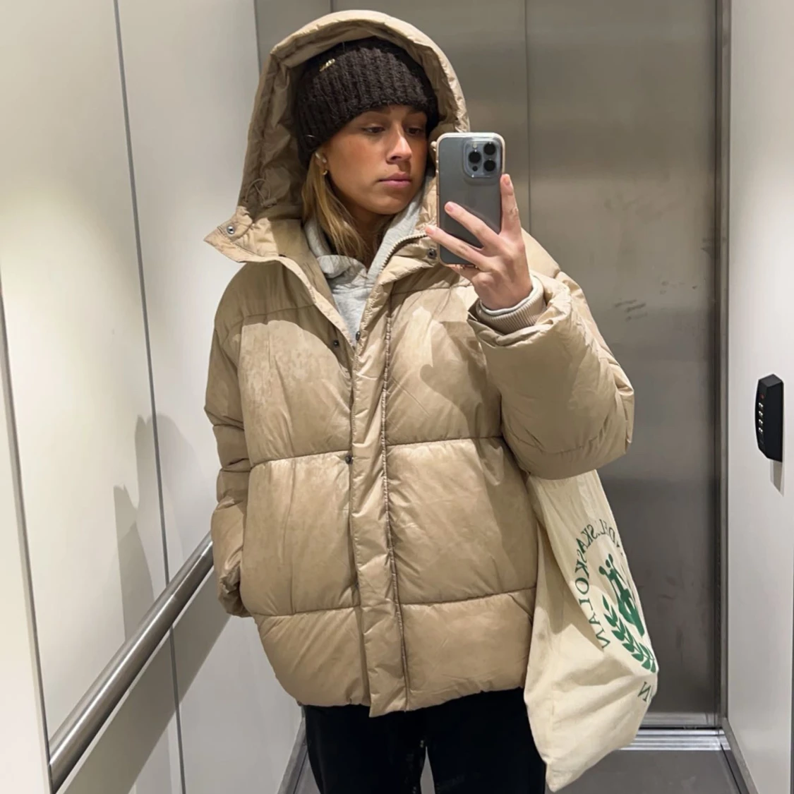 En skutsnyg varm gosig pufferjacka från monki använd sparsamt under en vinter. Lite halvt glansig och supervarm!