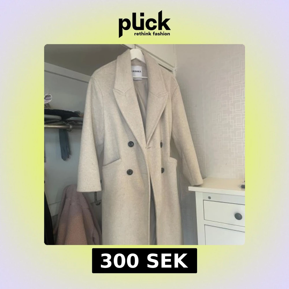 Säljer en stilren beige kappa från Bershka med dubbelknäppning och bred krage. Jackan har långa ärmar och två fickor framtill. Perfekt för dig som vill ha en klassisk och tidlös look.