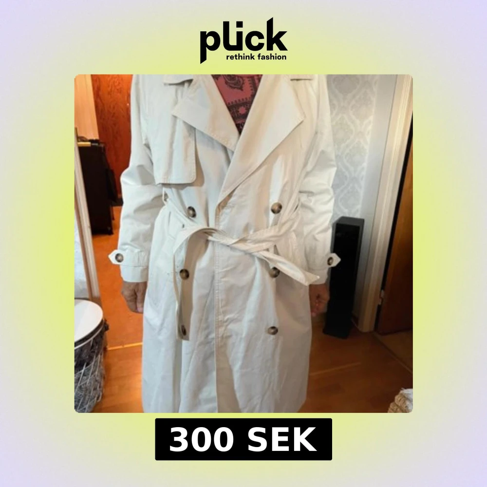Snygg beige trenchcoat med klassisk dubbelknäppning och bälte i midjan. Jackan har stora kragar, långa ärmar och dekorativa knappar. Perfekt för dig som gillar stilrena och tidlösa plagg.