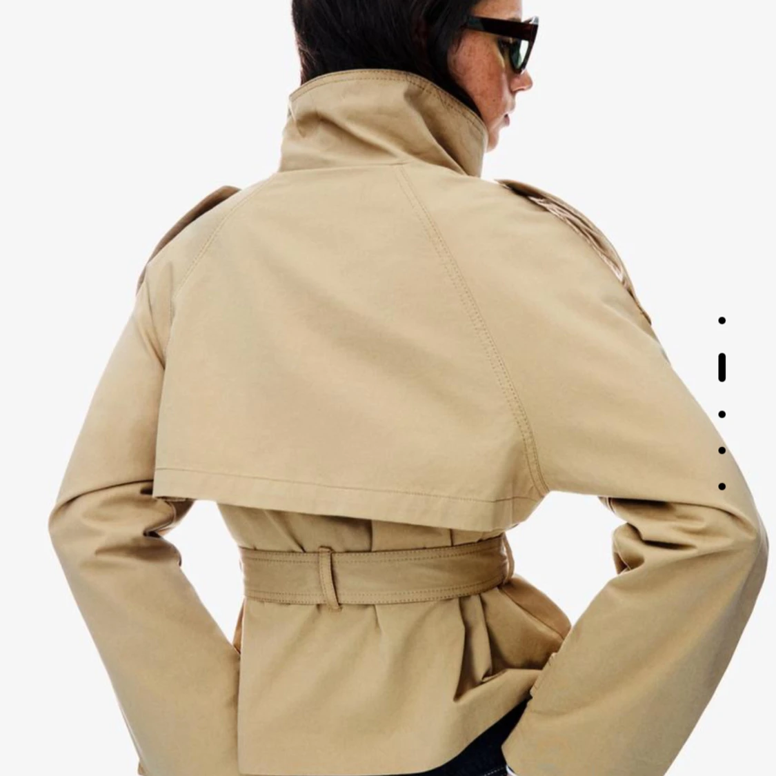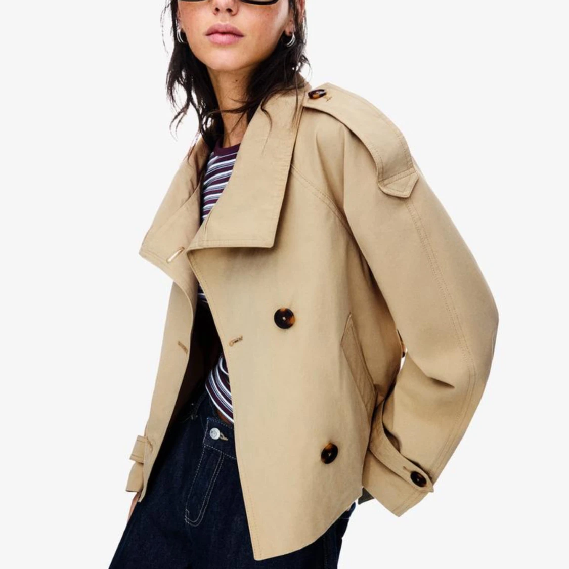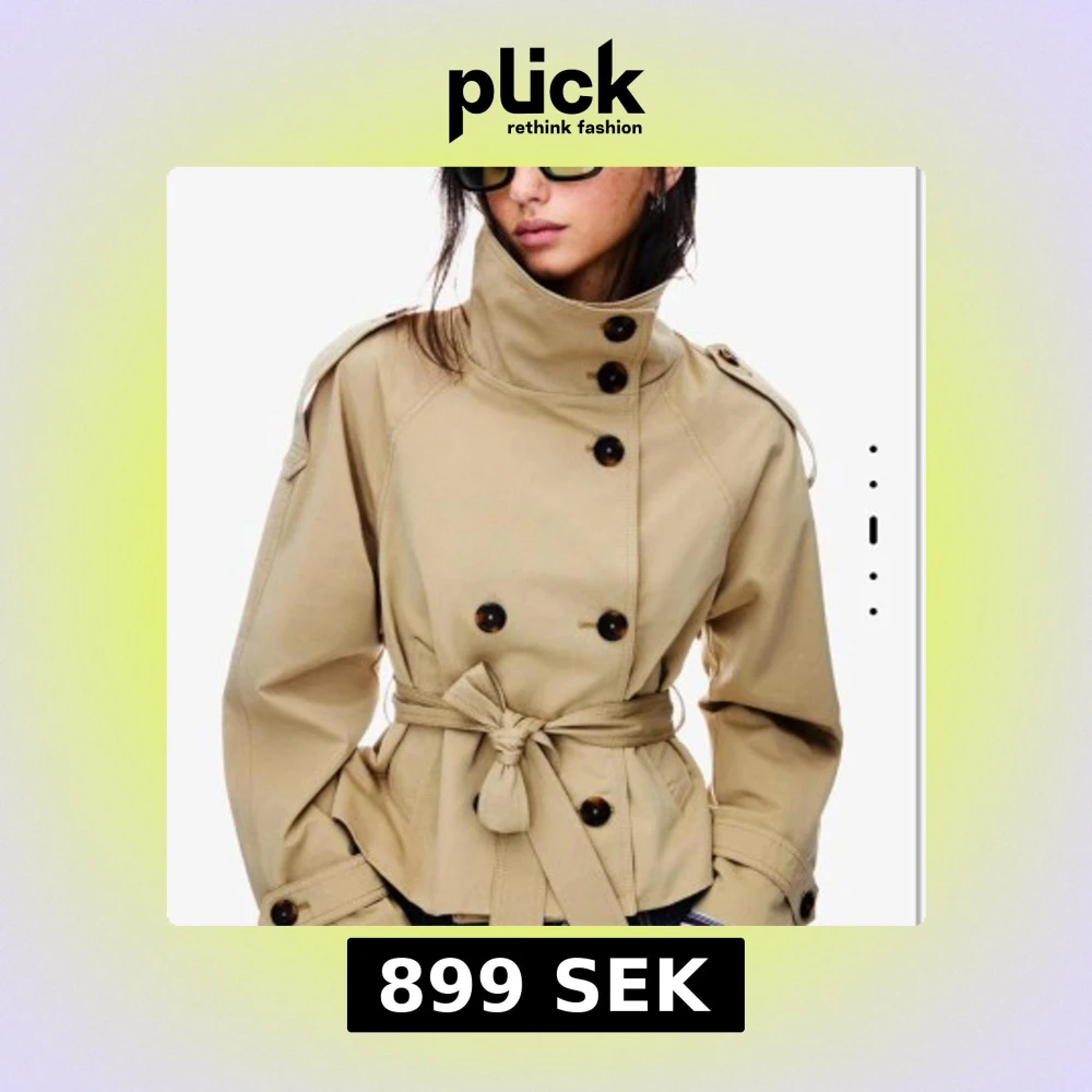 Snygg kort trenchcoat i beige med dubbelknäppning, stora knappar och bälte i midjan. Jackan har axelklaffar, hög krage och långa ärmar med knäppning vid ärmslut. Från bershka helt slutsåld
