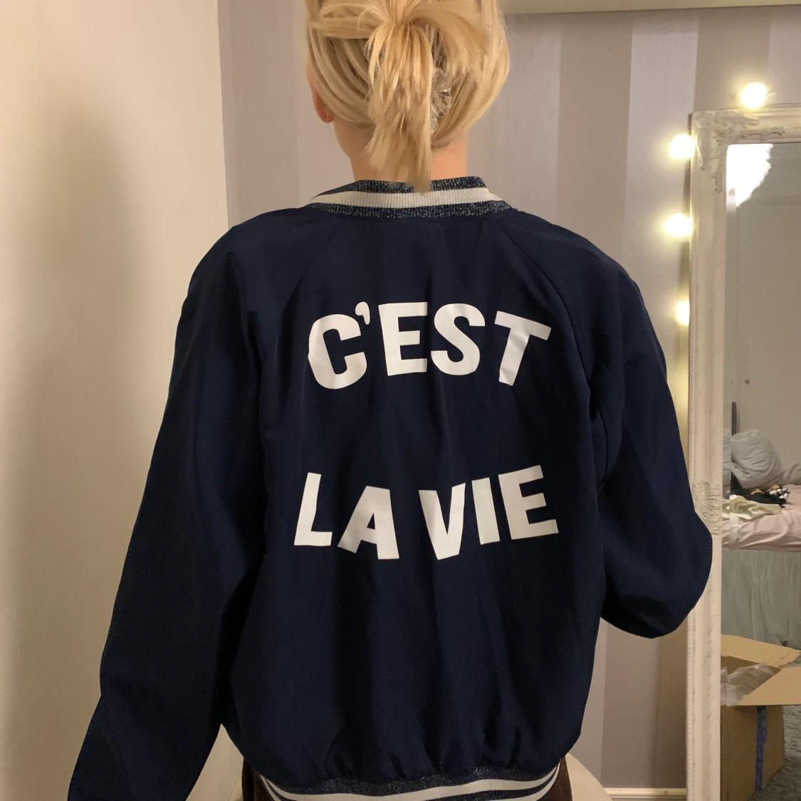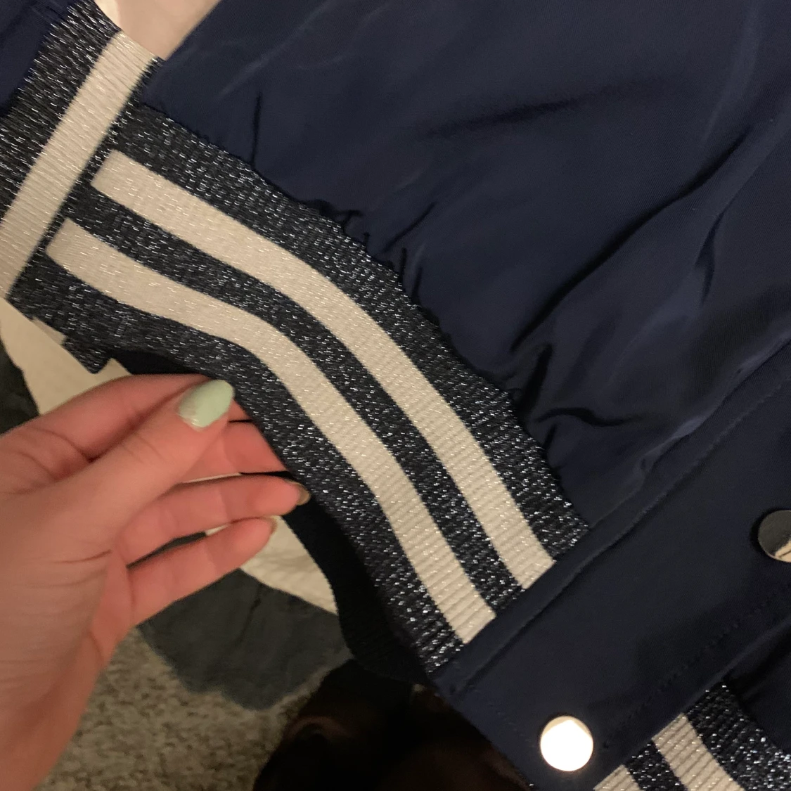Sjukt fin jacka i marinblå med glitter detaljer och det text på ryggen. Frakt 80kr
