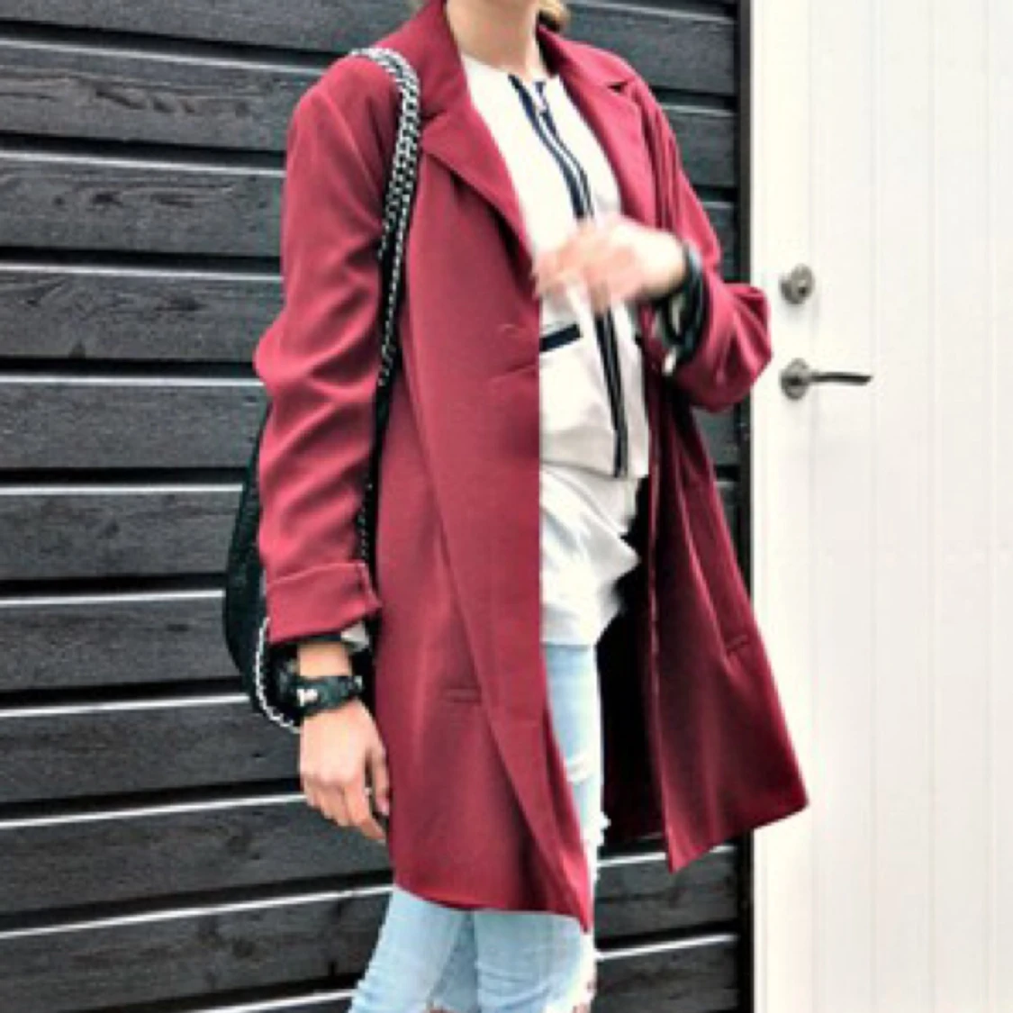 Tunn jacka köpt på Beyond Retro för några år sedan (alltså redan använd när jag köpte den). Den har två olika knappar, den översta är annorlunda än de andra. Kan mötas upp & tar swish.