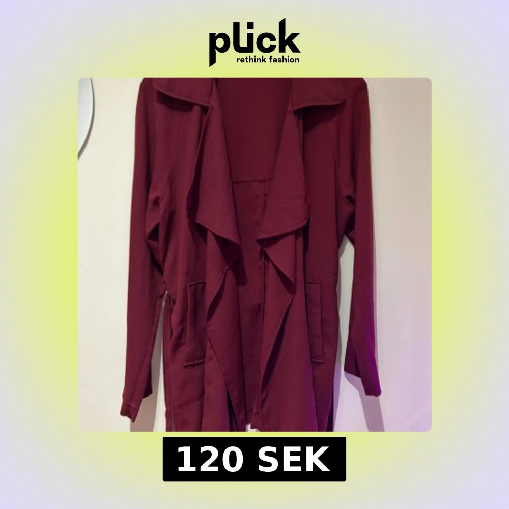 Säljer min vinröda kappa med långa ärmar och ett matchande bälte i midjan. Jackan har en öppen front med draperad krage och två fickor framtill. Perfekt för lager-på-lager och enkel att styla till olika outfits.
