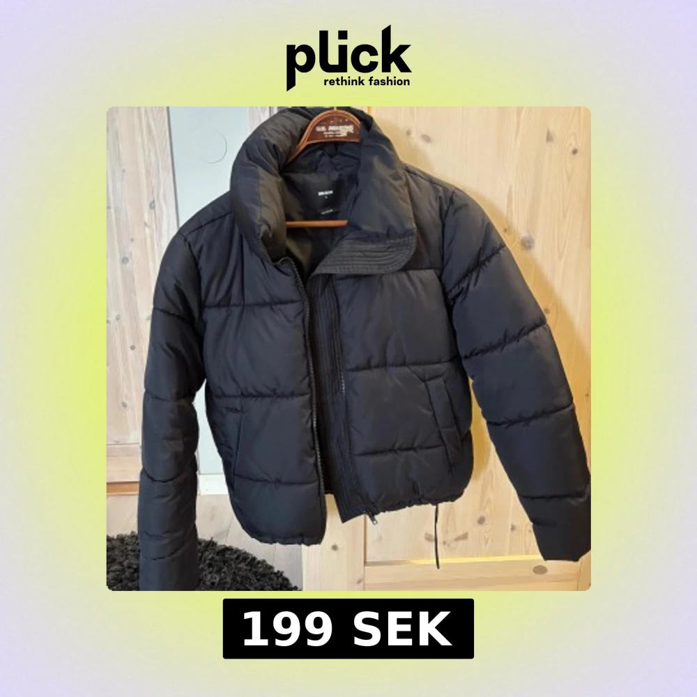 Svart pufferjacka från Bik Bok i storlek S. Jackan har hög krage, dragkedja framtill och dragsko nertill. Tillverkad i återvunnet material och har en klassisk quiltad look. Perfekt för kalla dagar och riktigt snygg till jeans eller mjukis. Köparen står för frakten.