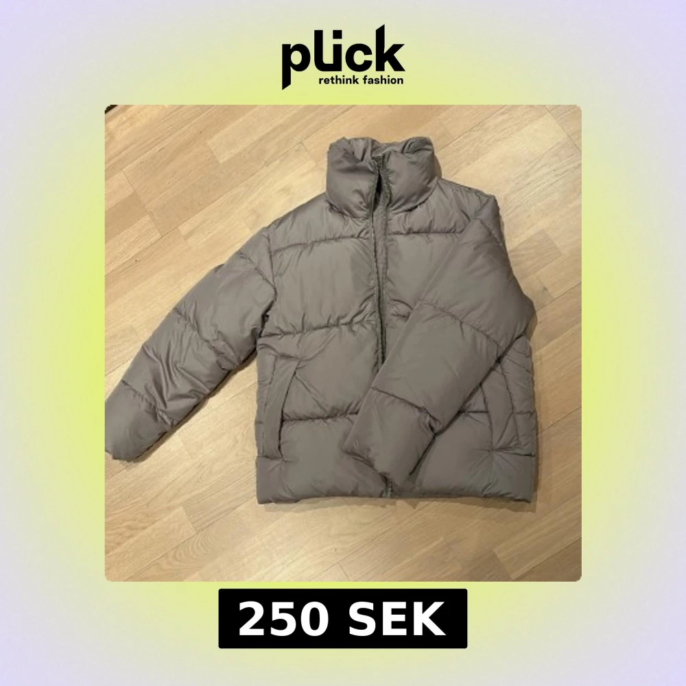 Säljer en stilren grå pufferjacka från BikBok i återvunnen polyester. Jackan har en dragkedja framtill och är perfekt för kyligare dagar. Den har en hög krage och långa ärmar för extra värme.