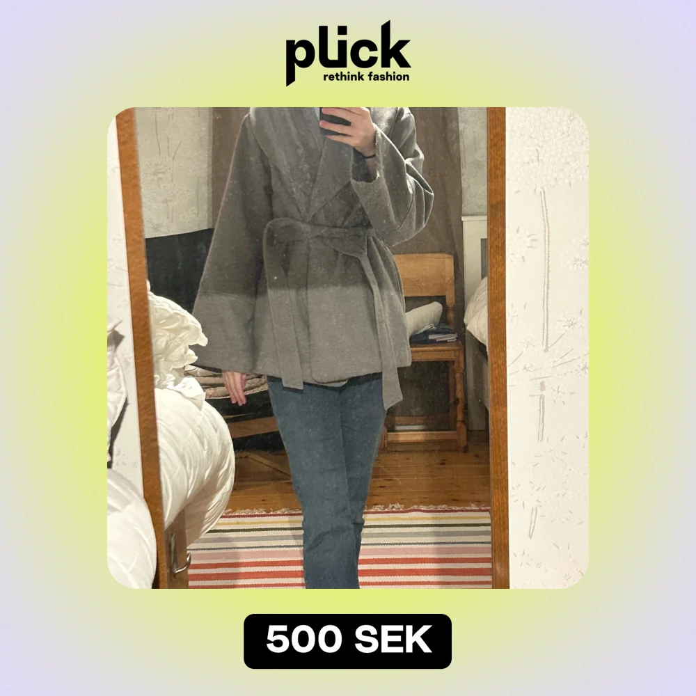 Säljer en superfin grå kappa med knytband i midjan. Den har en elegant och avslappnad stil med långa ärmar och en bred krage. Perfekt för höst och vår när du vill hålla dig varm och snygg. Passar till både jeans och klänning!