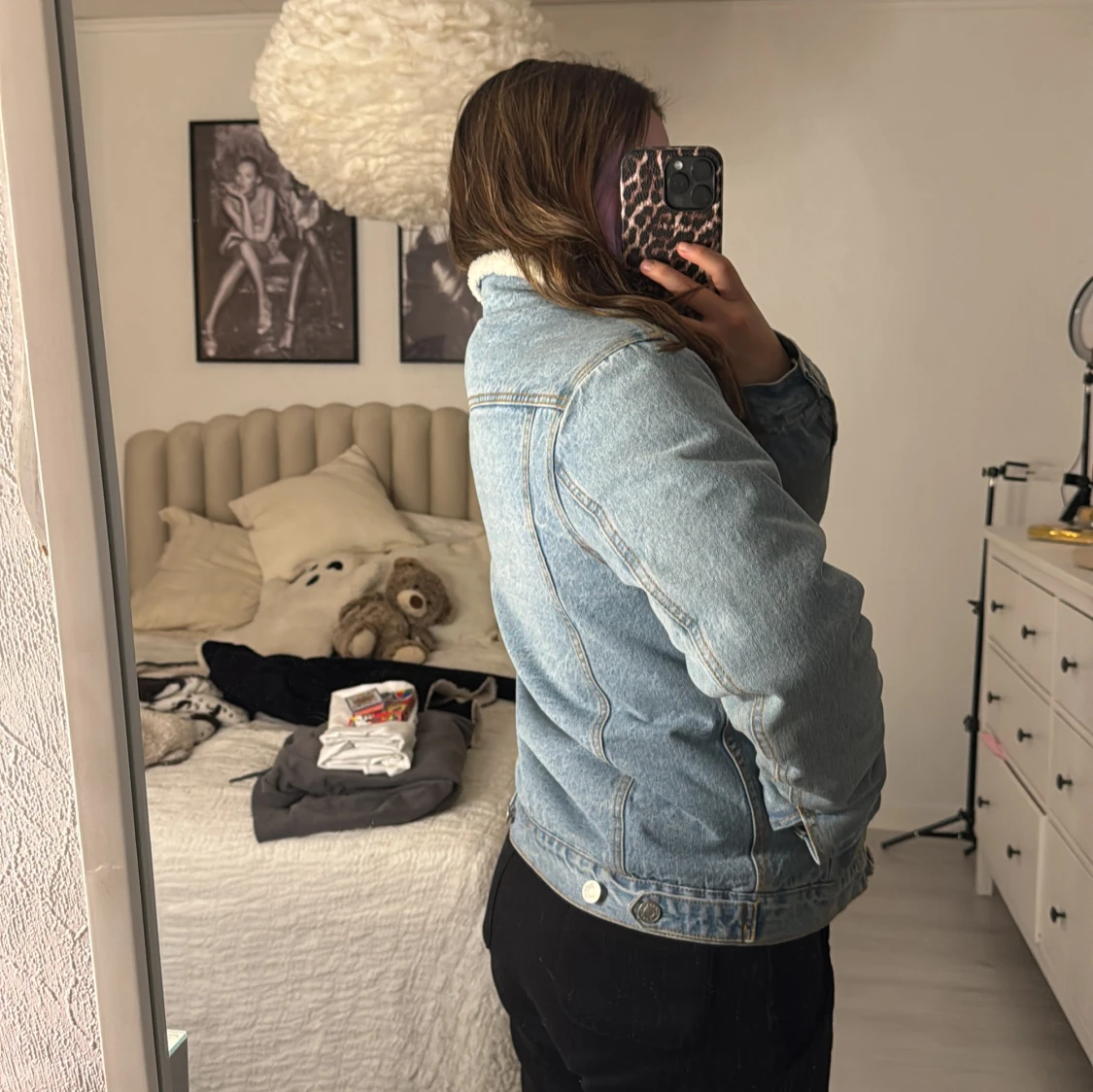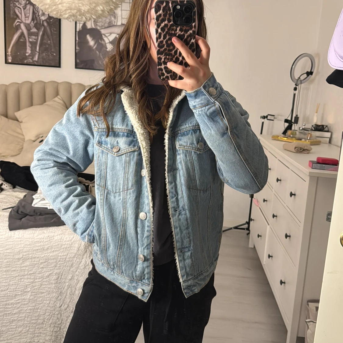 Säljer en snygg ljusblå jeansjacka med mysigt vitt teddyfoder. Jackan har en klassisk design med knappar framtill och två bröstfickor. Perfekt för höst och vår när du vill hålla stilen men ändå vara varm. Passar till både vardag och fest!