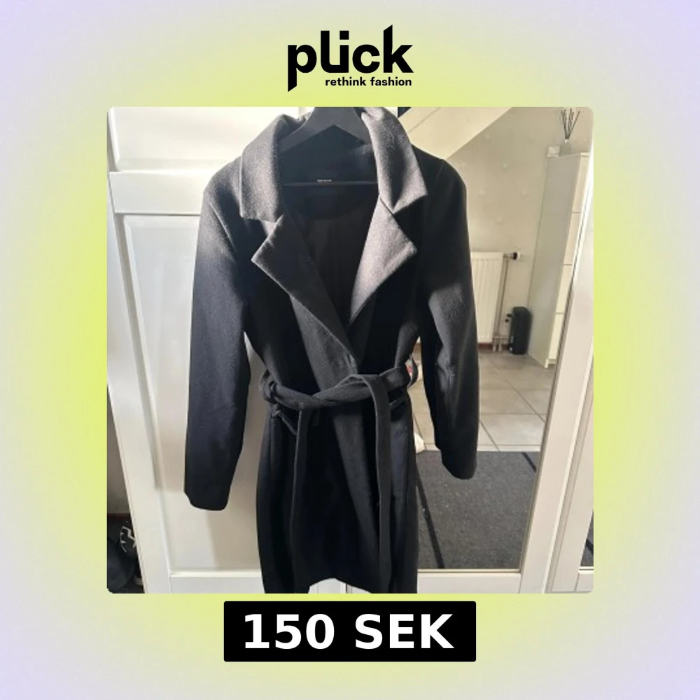 Stilren svart kappa från Bik Bok i storlek XS. Kappan har klassisk krage, långa ärmar och knyts med bälte i midjan för en snygg siluett. Perfekt för kyligare dagar och enkel att matcha med olika outfits.