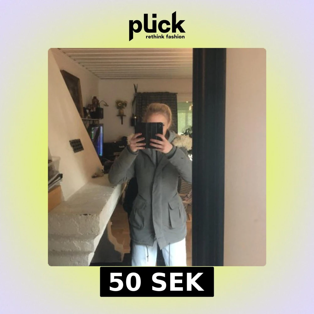 Säljer en grå parkajacka med huva och stora fickor framtill. Jackan har lång ärm och stängs med dragkedja och knappar. Perfekt för kyligare dagar och har en klassisk, enkel design.