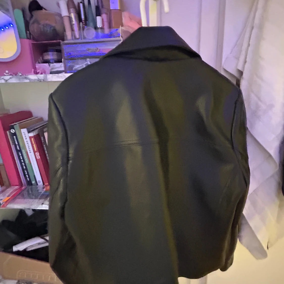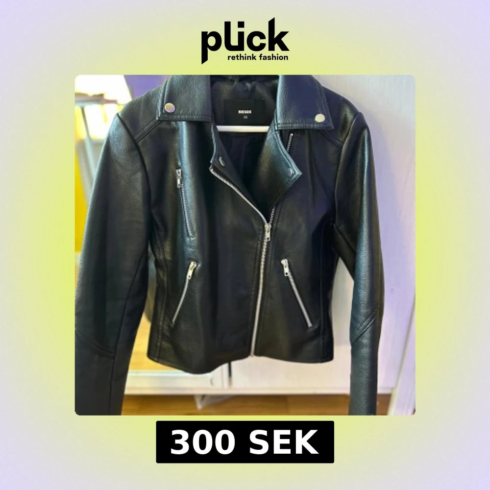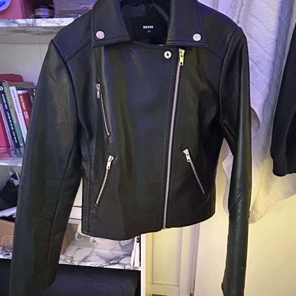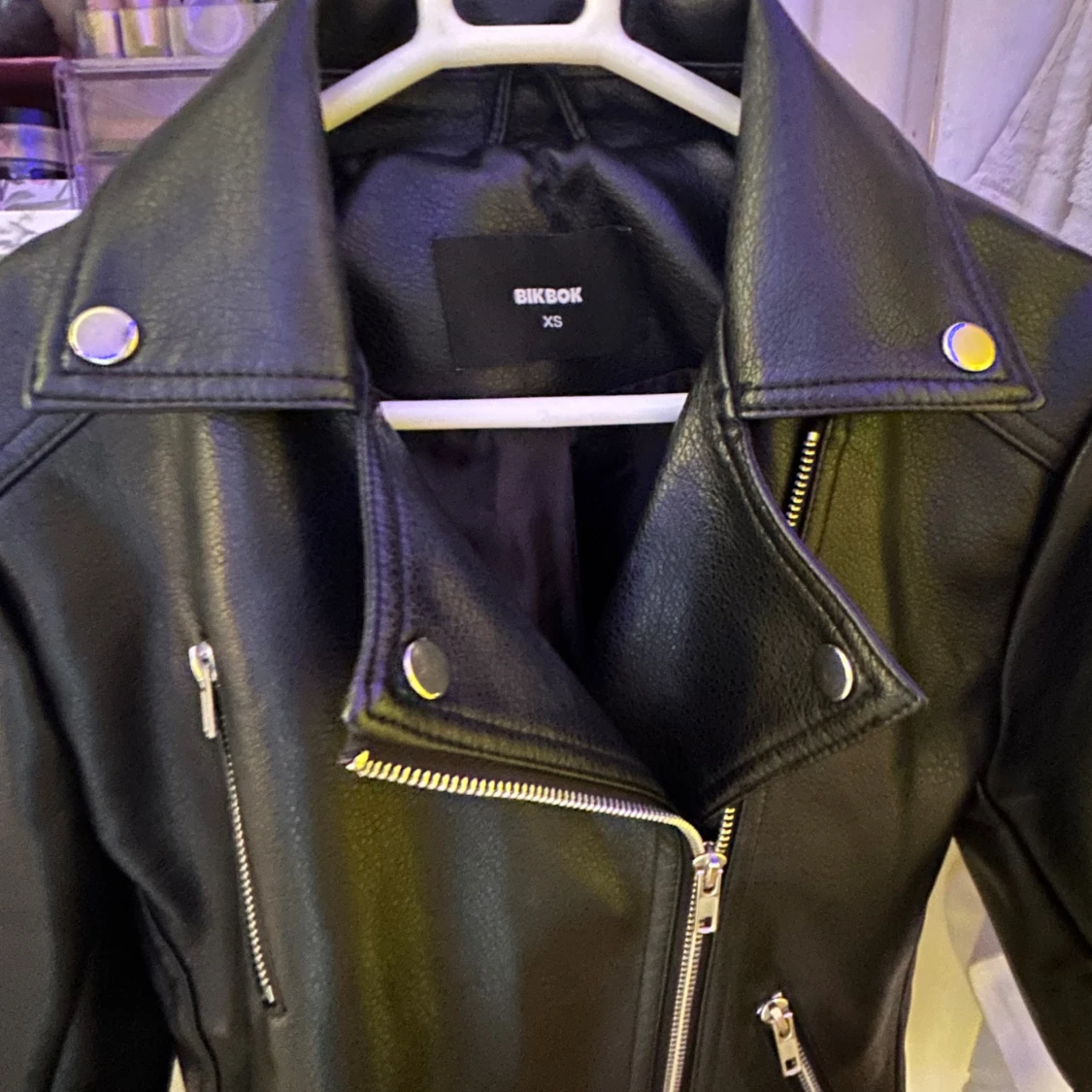 Snygg svart skinnjacka från Bik Bok i bikerstil med silvriga dragkedjor och tryckknappar. Jackan har klassisk krage, flera fickor med dragkedja och en croppad passform. Perfekt för dig som vill ha en edgy look.