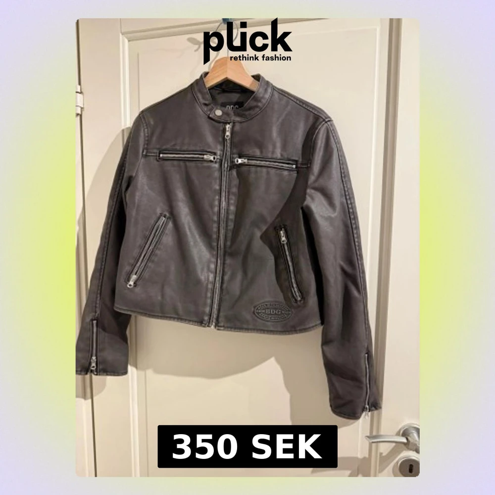 Dragkedjor framtill och på ärmarna. Jackan har en kortare, boxig passform och ståkrage med tryckknapp. Snygga detaljer och BDG-logga på framsidan. Knappt använd. Ej äkta läder!