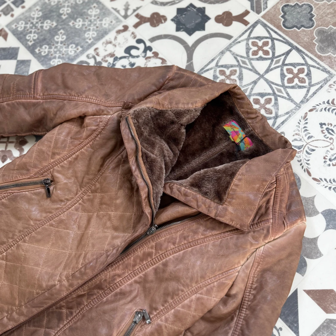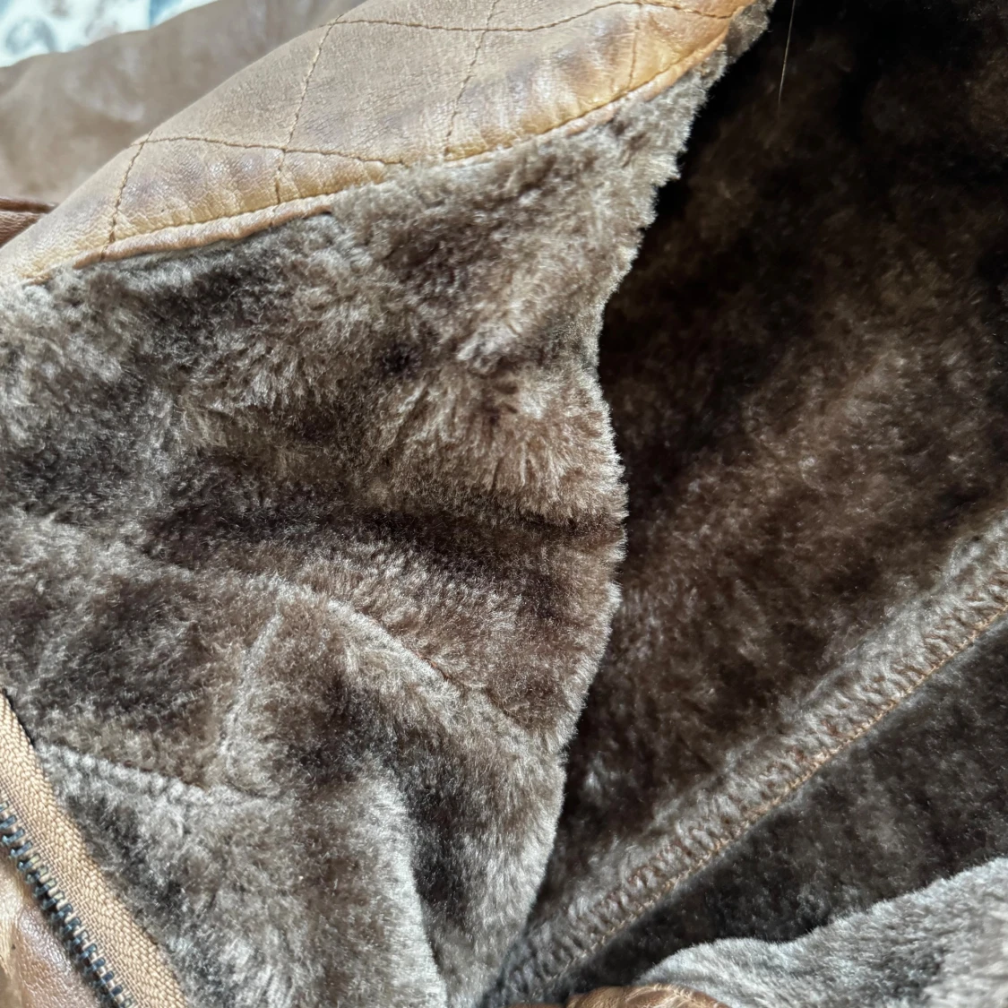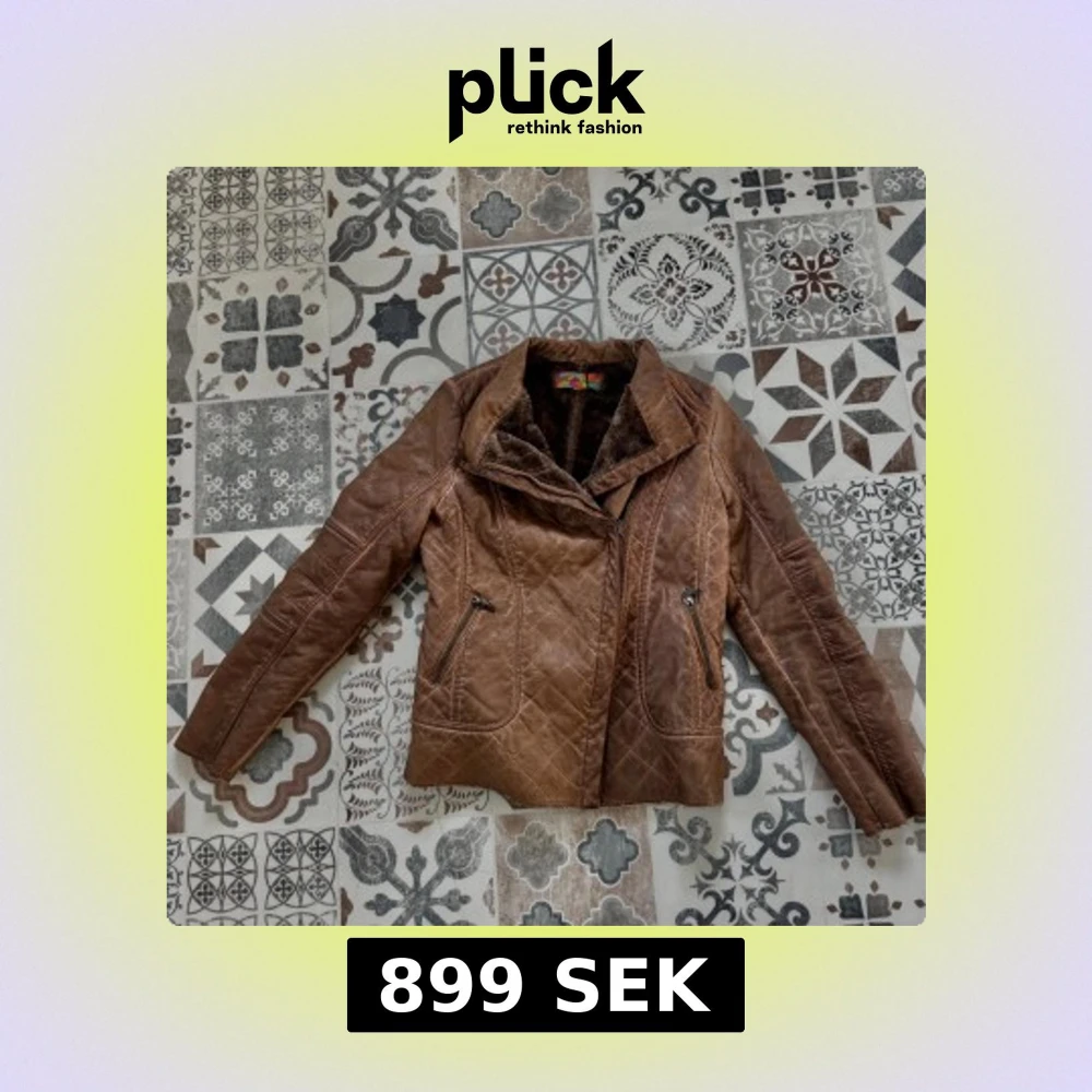 Snygg brun skinnjacka med quiltade detaljer och mjuktpälsfoder. Jackan har dragkedja framtill och två zip-fickor. Perfekt för dig som gillar en cool och varm look med lite biker-vibe. Jackan är storlek S herr men passar kvinnor också om man vill det. Kan skicka mått om de behövs!