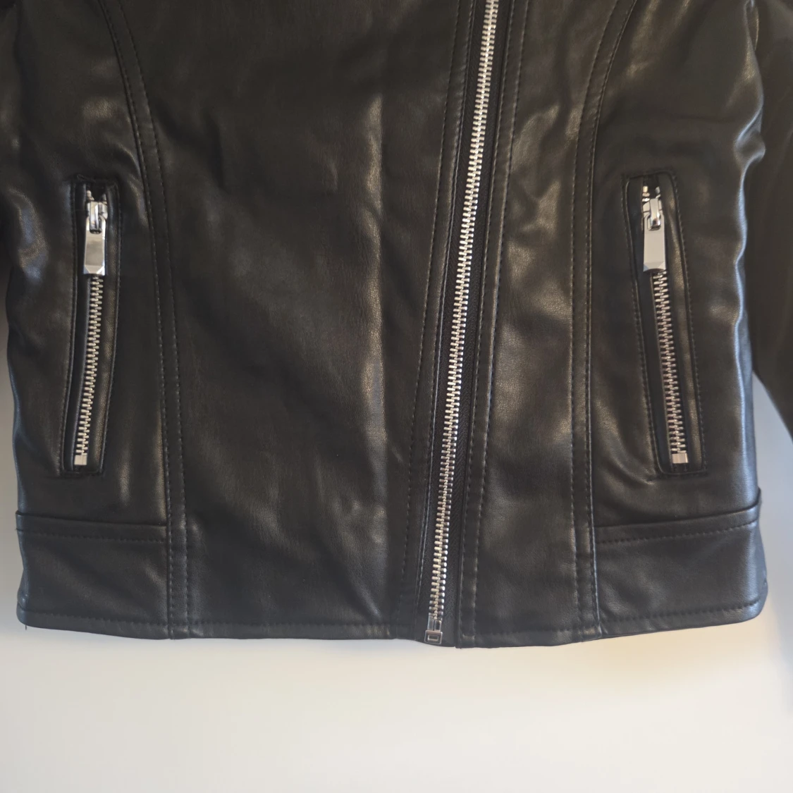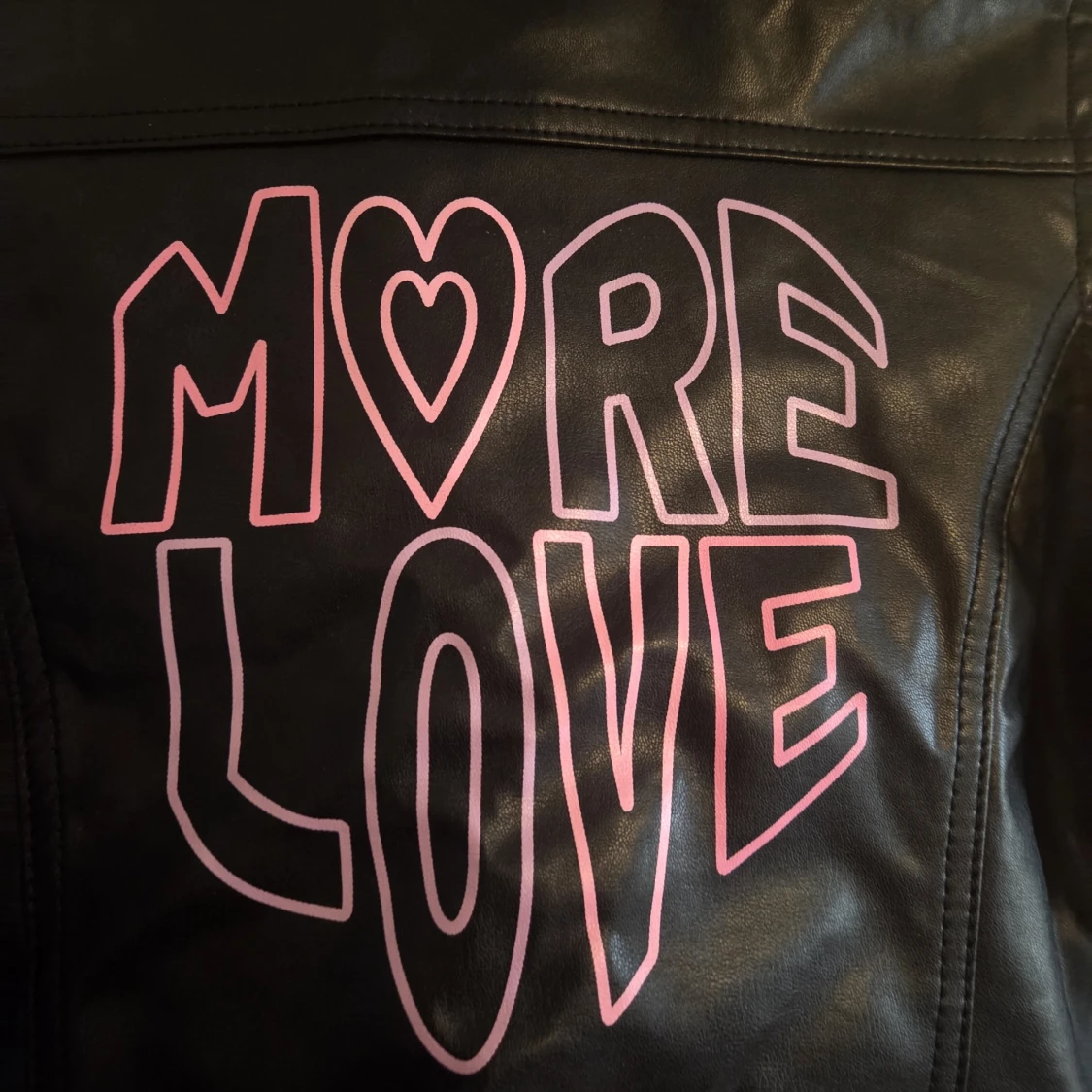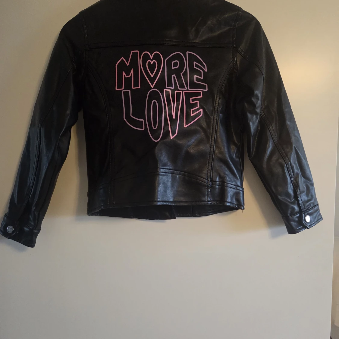 Cool svart skinnjacka från OVS kids med lång ärm och silverfärgade dragkedjor fram och på fickorna. På ryggen finns ett stort rosa tryck med texten 'MORE LOVE' och ett hjärta. Jackan har klassisk bikerstil och är perfekt för dig som vill sticka ut.