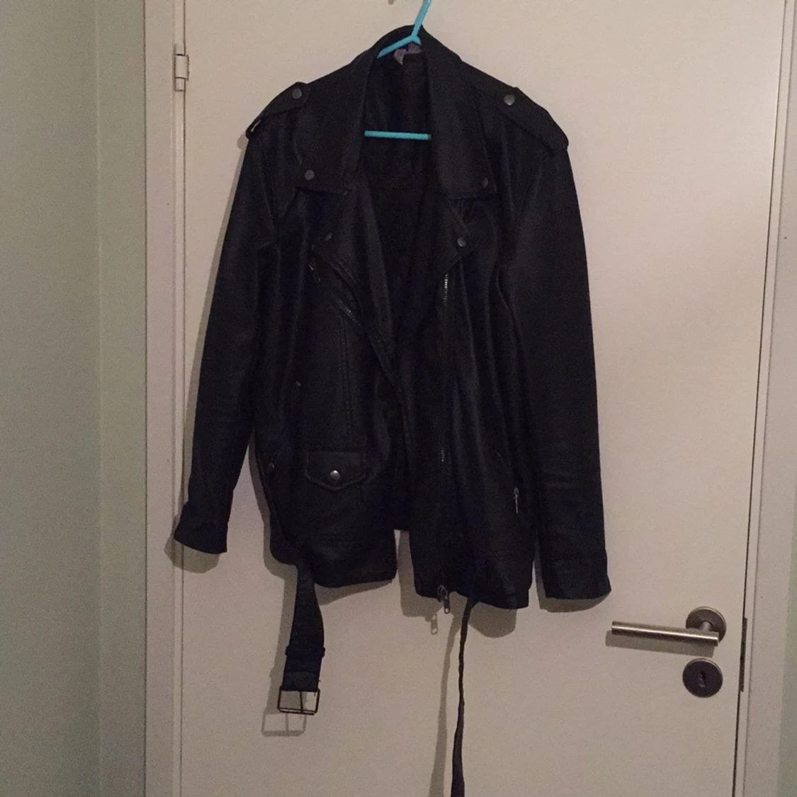 Svart matt oversized fejk skinnjacka med snygga detaljer från HM. Passar en 36 likväl en 38. Jackan är inköpt i somras och i väldigt bra skick. Fungerar utmärkt med en tjocktröja under. Nypris 599kr. Frakt 75kr.