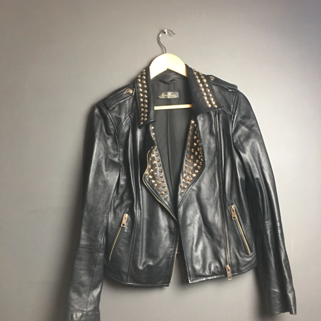 Svart skinnjacka från Zara med guldfärgade nitar. Står inte storlek men gissar på att det är en S-M