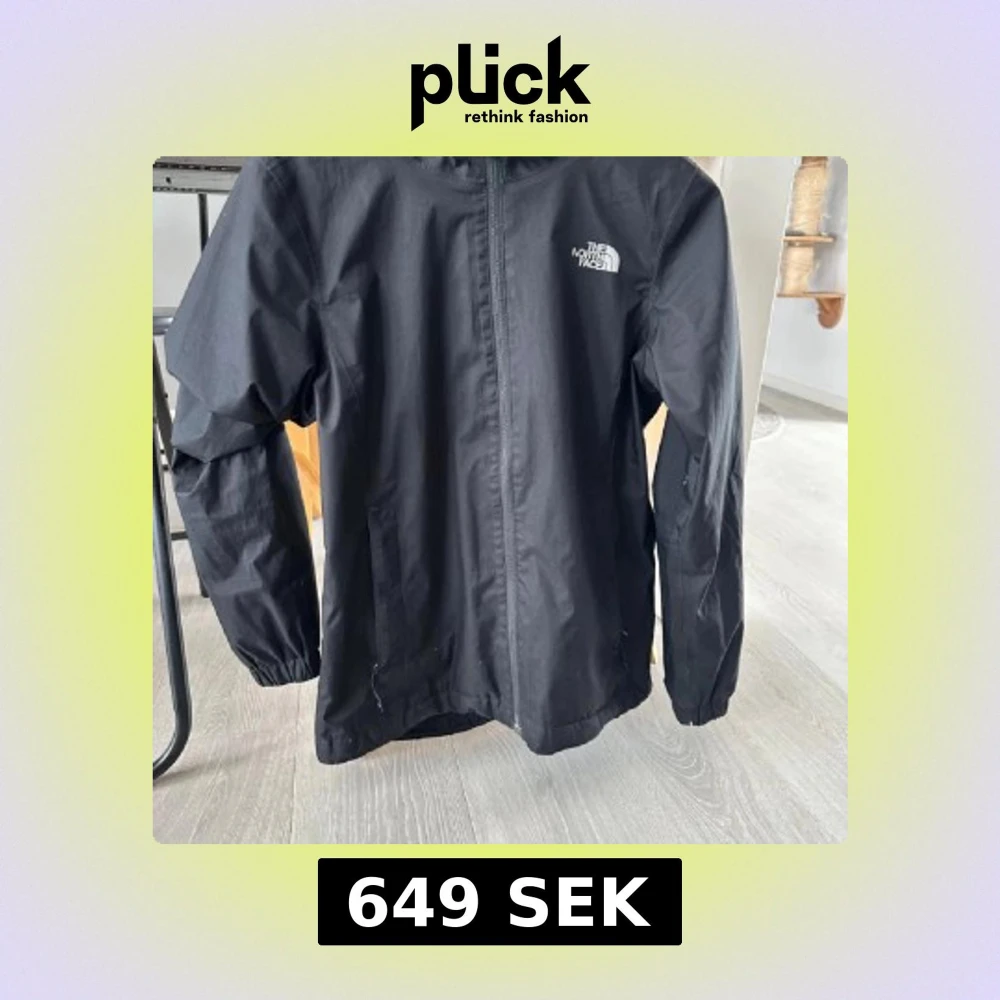 Svart vindjacka från The North Face med huva och dragkedja framtill. Jackan har två sidofickor med dragkedja och elastiska muddar vid ärmslut. Materialet är lätt och andas, perfekt för blåsiga dagar. Snygg logga på bröstet och ryggen.