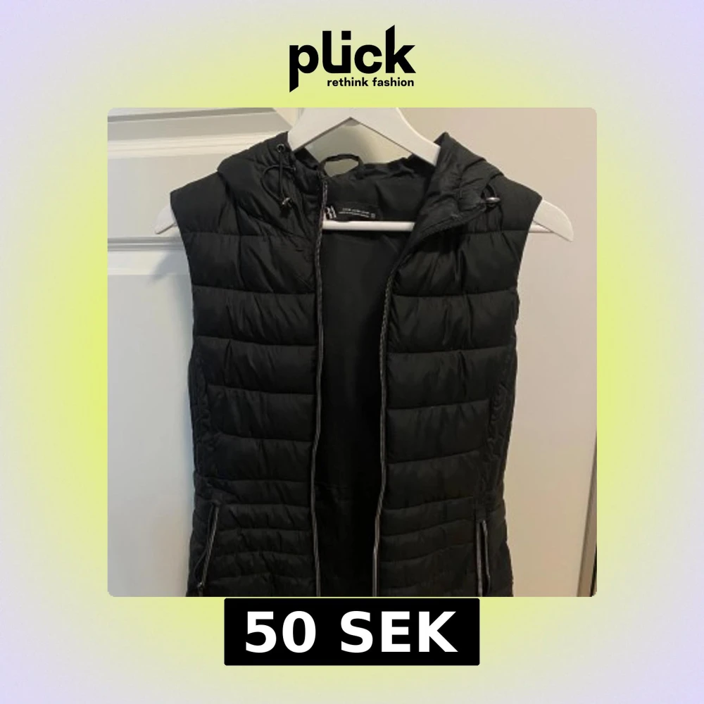 Snygg svart dunväst från Zara med dragkedja och huva. Perfekt för lager-på-lager under kyliga dagar. Västen har praktiska fickor med dragkedjor.