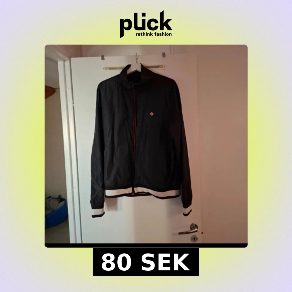 Säljer en svart vindjacka med vita och svarta ribbade muddar nertill och vid ärmslut. Jackan har dragkedja framtill och en liten röd logga på bröstet. Perfekt för svala dagar och enkel att matcha med det mesta.