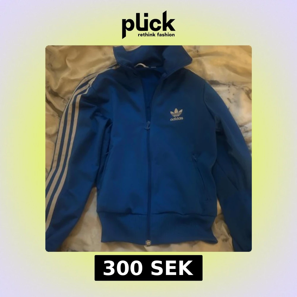 Snygg blå Adidas track jacket med klassiska vita ränder längs ärmarna och stort vitt trefoil-tryck på ryggen. Jackan har dragkedja framtill, hög krage och ribbade muddar. Perfekt för en sportig och retro vibe.